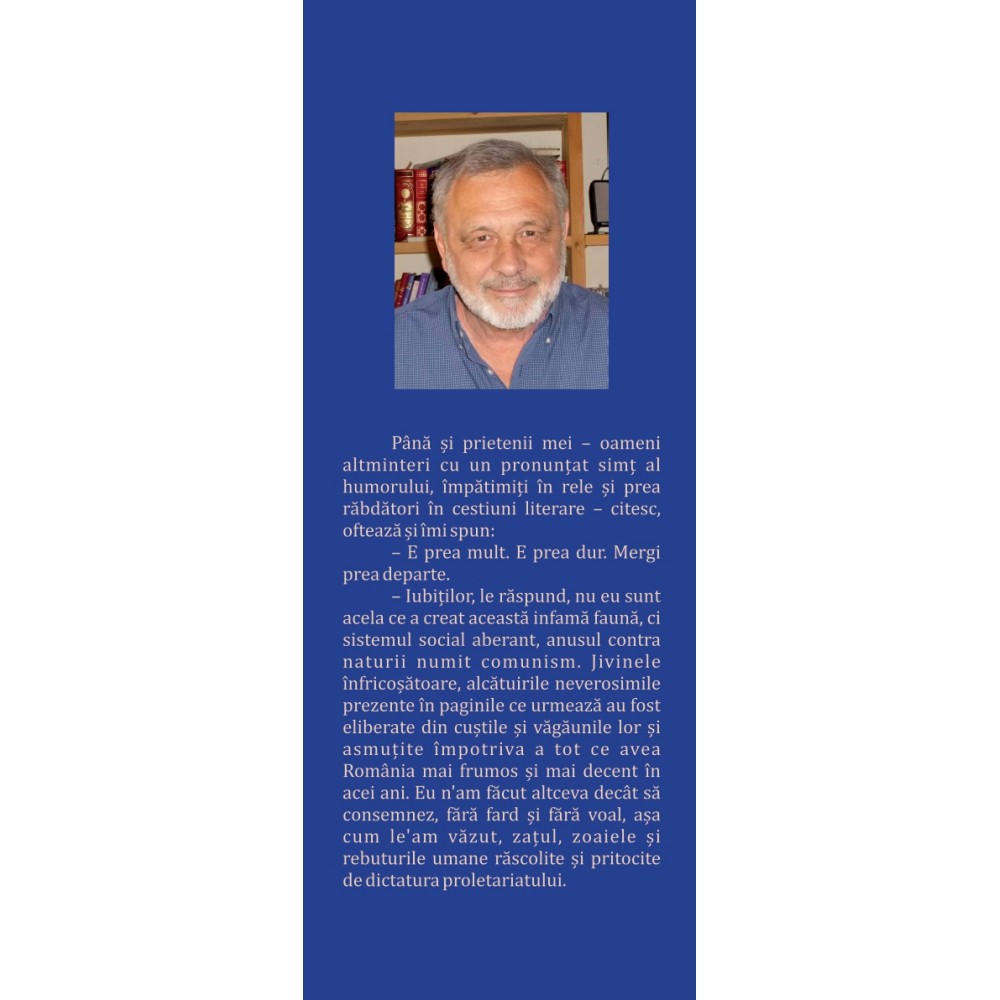 – Iubiților, le răspund, nu eu sunt acela ce a creat această infamă faună, ci sistemul social aberant, anusul contra naturii numit comunism. Jivinele înfricoșătoare, alcătuirile neverosimile prezente în paginile ce urmează au fost eliberate din cuștile și văgăunile lor și asmuțite împotriva a tot ce avea România mai frumos și mai decent în acei ani. Eu n’am făcut altceva decât să consemnez, fără fard și fără voal, așa cum le’am văzut, zațul, zoaiele și rebuturile umane răscolite și pritocite de dictatura proletariatului.”