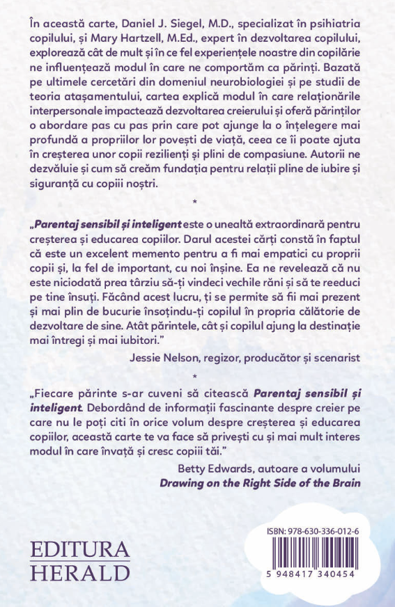 In aceasta carte, Daniel J. Siegel, M.D., specializat in psihiatria copilului, si Mary Hartzell, M.Ed., expert in dezvoltarea copilului, exploreaza cat de mult si in ce fel experientele noastre din copilarie ne influenteaza modul in care ne comportam ca parinti. Bazata pe ultimele cercetari din domeniul neurobiologiei si pe studii de teoria atasamentului, cartea explica modul in care relationarile interpersonale impacteaza dezvoltarea creierului si ofera parintilor o abordare pas cu pas prin care pot ajunge la o intelegere mai profunda a propriilor lor povesti de viata, ceea ce ii poate ajuta in cresterea unor copii rezilienti si plini de compasiune. Autorii ne dezvaluie si cum sa cream fundatia pentru relatii pline de iubire si siguranta cu copiii nostri.