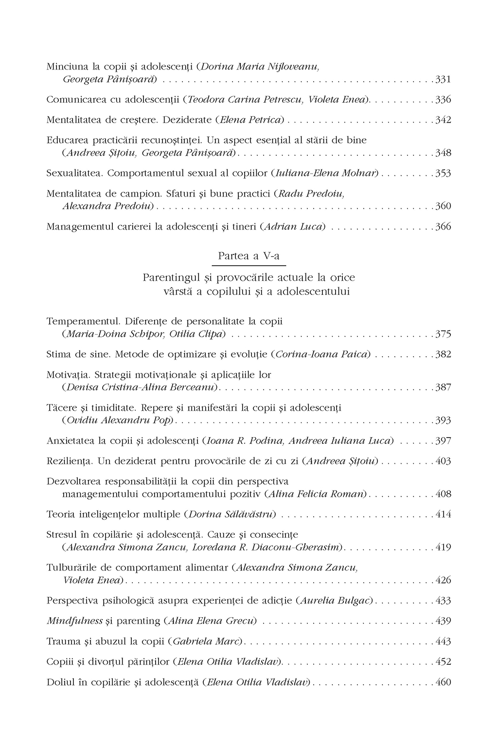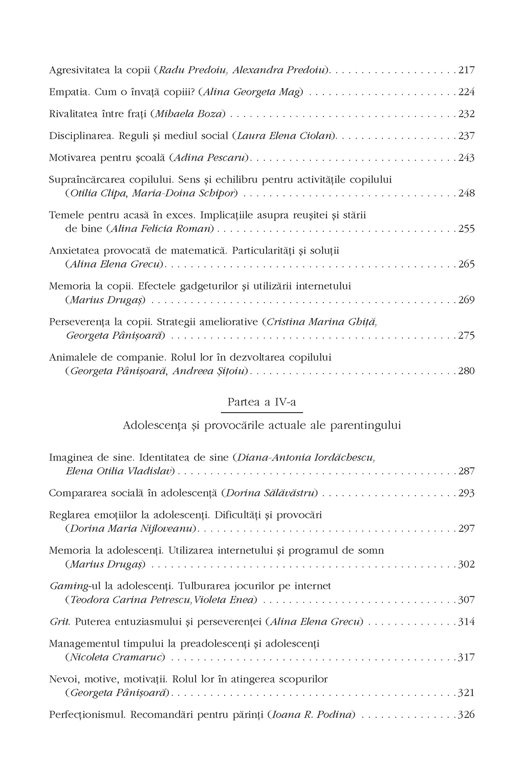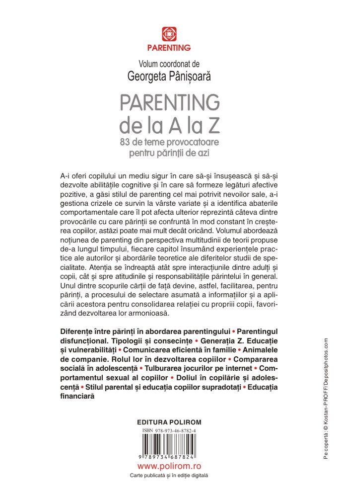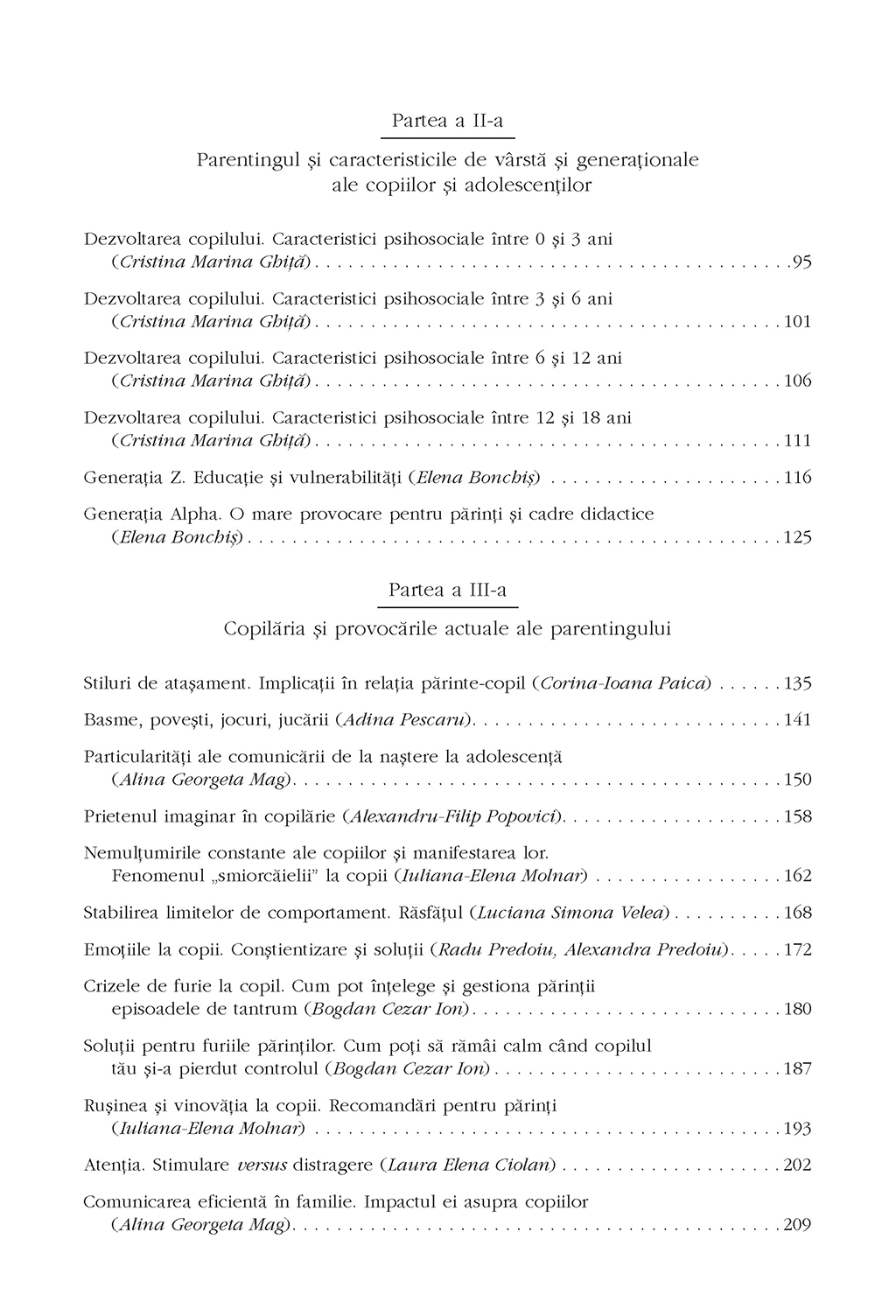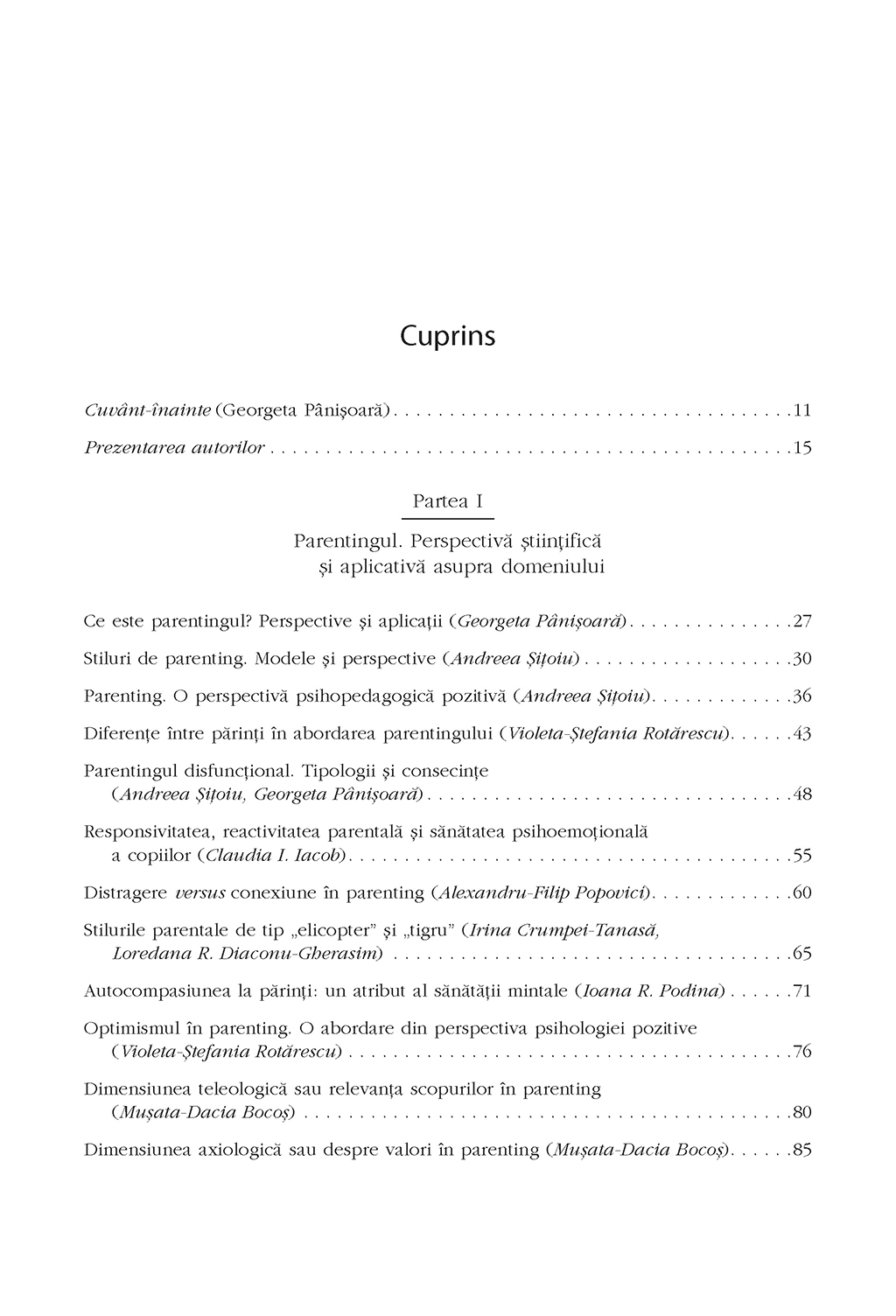A-i oferi copilului un mediu sigur în care să-și însușească și să-și dezvolte abilitățile cognitive și în care să formeze legături afective pozitive, a găsi stilul de parenting cel mai potrivit nevoilor sale, a-i gestiona crizele ce survin la vârste variate și a identifica abaterile comportamentale care îl pot afecta ulterior reprezintă câteva dintre provocările cu care părinții se confruntă în mod constant în creșterea copiilor, astăzi poate mai mult decât oricând. Volumul abordează noțiunea de parenting din perspectiva multitudinii de teorii propuse de-a lungul timpului, fiecare capitol însumând experiențele practice ale autorilor și abordările teoretice ale diferitelor studii de specialitate. Atenția se îndreaptă atât spre interacțiunile dintre adulți și copii, cât și spre atitudinile și responsabilitățile părintelui în general. Unul dintre scopurile cărții de față devine, astfel, facilitarea, pentru părinți, a procesului de selectare asumată a informațiilor și a aplicării acestora pentru consolidarea relației cu propriii copii, favorizând dezvoltarea lor armonioasă.