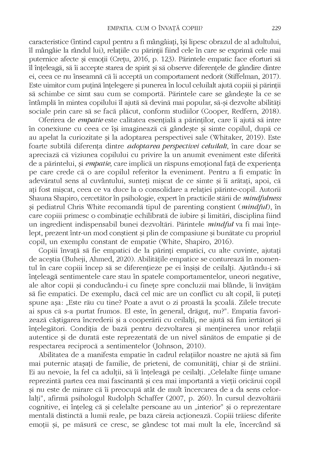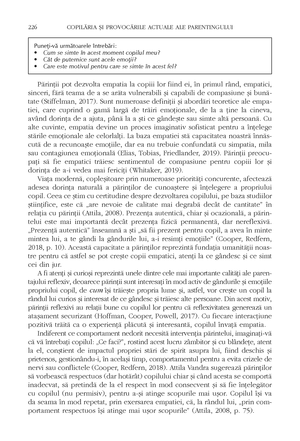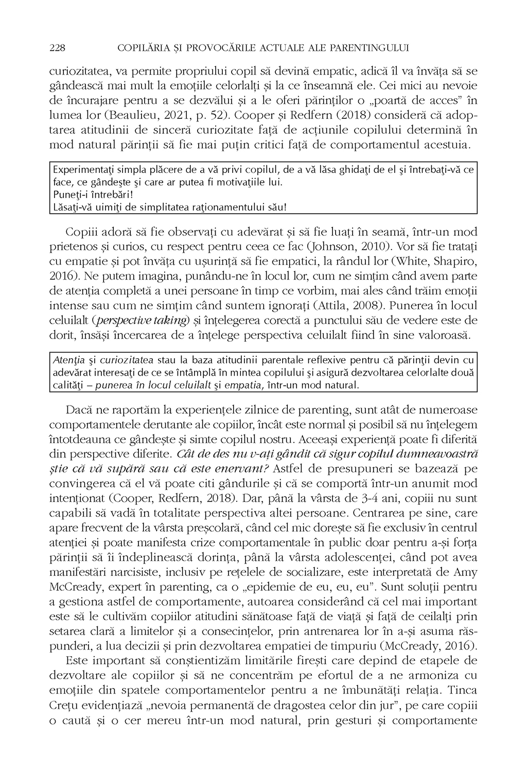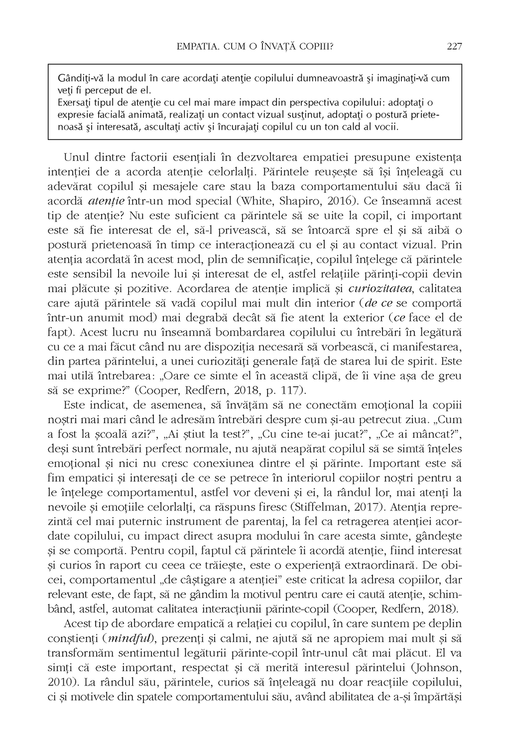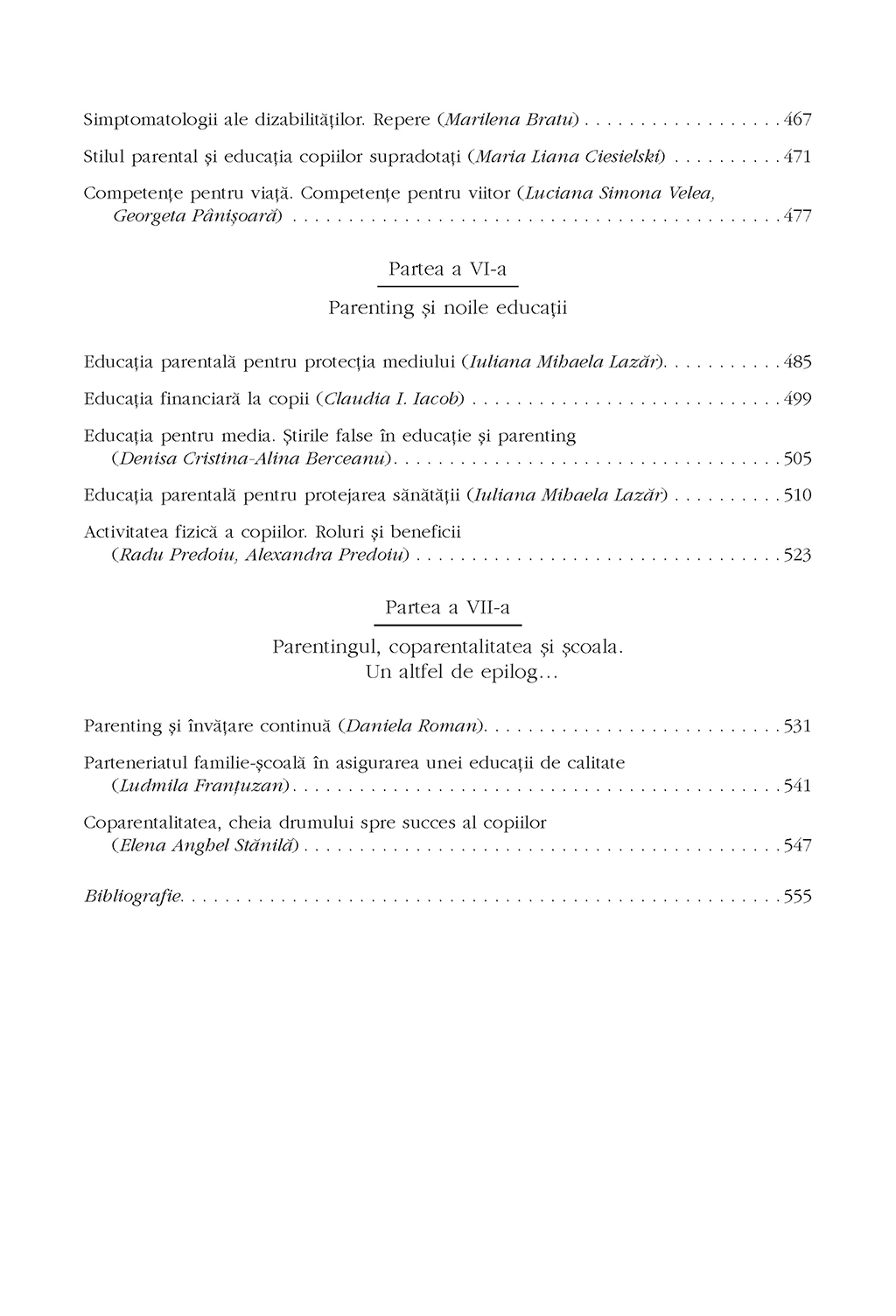 A-i oferi copilului un mediu sigur în care să-și însușească și să-și dezvolte abilitățile cognitive și în care să formeze legături afective pozitive, a găsi stilul de parenting cel mai potrivit nevoilor sale, a-i gestiona crizele ce survin la vârste variate și a identifica abaterile comportamentale care îl pot afecta ulterior reprezintă câteva dintre provocările cu care părinții se confruntă în mod constant în creșterea copiilor, astăzi poate mai mult decât oricând. Volumul abordează noțiunea de parenting din perspectiva multitudinii de teorii propuse de-a lungul timpului, fiecare capitol însumând experiențele practice ale autorilor și abordările teoretice ale diferitelor studii de specialitate. Atenția se îndreaptă atât spre interacțiunile dintre adulți și copii, cât și spre atitudinile și responsabilitățile părintelui în general. Unul dintre scopurile cărții de față devine, astfel, facilitarea, pentru părinți, a procesului de selectare asumată a informațiilor și a aplicării acestora pentru consolidarea relației cu propriii copii, favorizând dezvoltarea lor armonioasă.