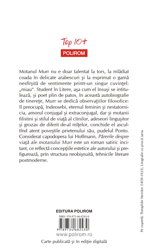 Motanul Murr nu e doar talentat la tors, la mlădiat coada în delicate arabescuri şi la exprimat o gamă nesfîrşită de sentimente printr-un singur cuvinţel: „miau”. Student în Litere, aşa cum el însuşi se intitulează, şi poet plin de patos, în această autobiografie de tinereţe, Murr se dedică observaţiilor filosofice: îl preocupă, îndeosebi, eternul feminin şi nestatornicia, amorul conjugal şi extraconjugal, dar şi motanii filistini şi stilul de viaţă al cîinilor, adeseori linguşitor şi grozav de diferit de-al mîţelor, conchide el ascultînd atent poveştile prietenului său, pudelul Ponto. Considerat capodopera lui Hoffmann, Părerile despre viaţă ale motanului Murr este un roman satiric incitant, ce reflectă concepţiile estetice ale autorului şi prefigurează, prin structura neobişnuită, tehnicile literare postmoderne.