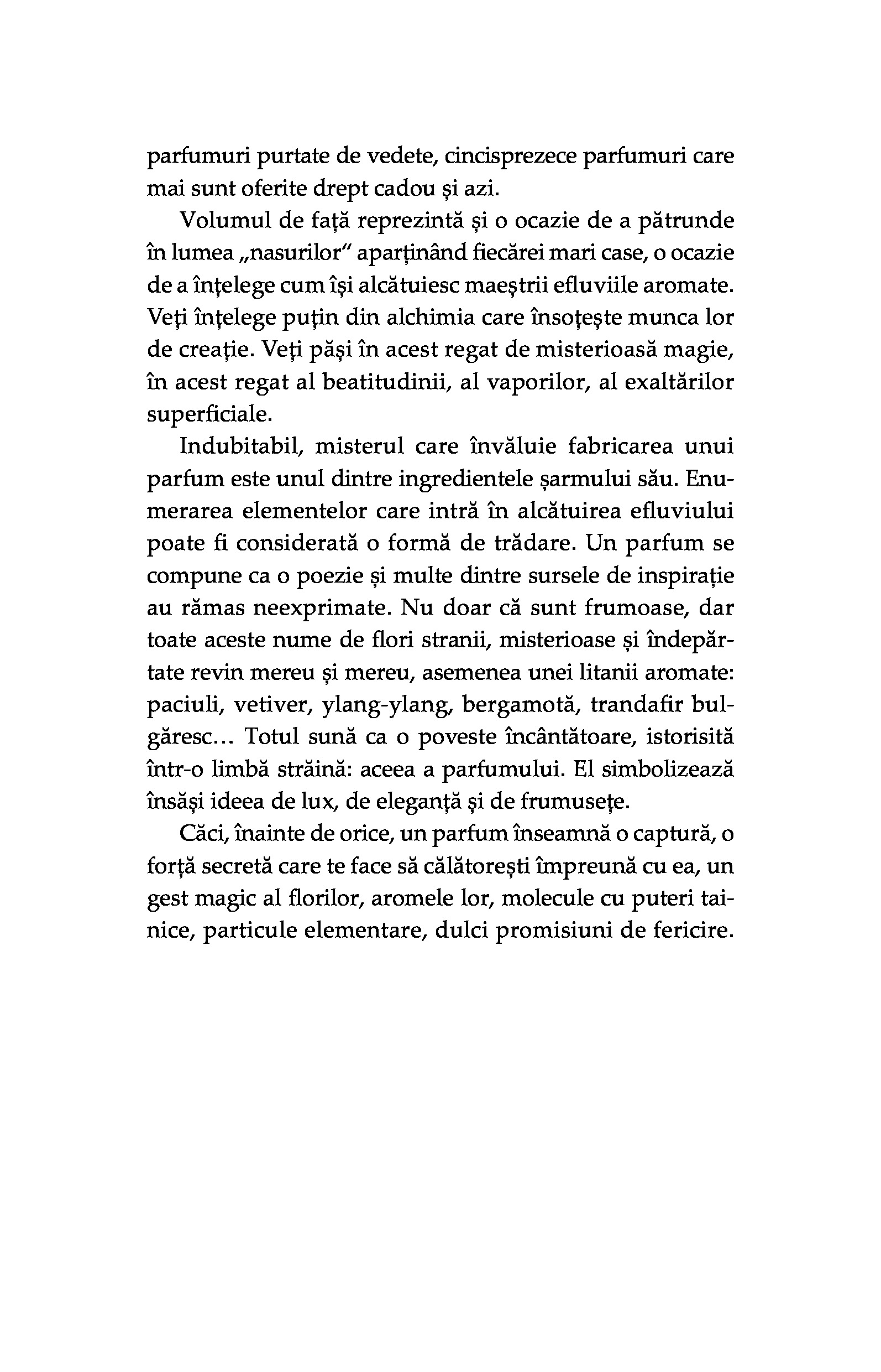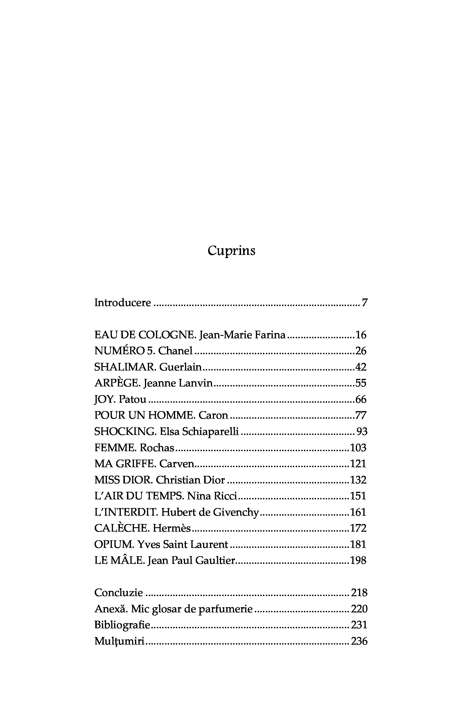 De la Miss Dior și Chanel Nᵒ 5 la Opium, de la Arpège la Joy, Calèche și L’Interdit, de la L’Air du Temps, Aqua Allegoria și Ma Griffe la Shalimar și Shocking, fiecare parfum celebru cu istoria lui secretă și pasionantă.