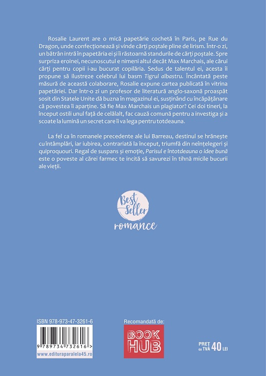 La fel ca în romanele precedente ale lui Barreau, destinul se hrăneşte cu întâmplări, iar iubirea, contrariată la început, triumfă din neînţelegeri şi quiproquouri. Regal de suspans şi emoţie, Parisul e întotdeauna o idee bună este o poveste al cărei farmec te incită să savurezi în tihnă micile bucurii ale vieţii.