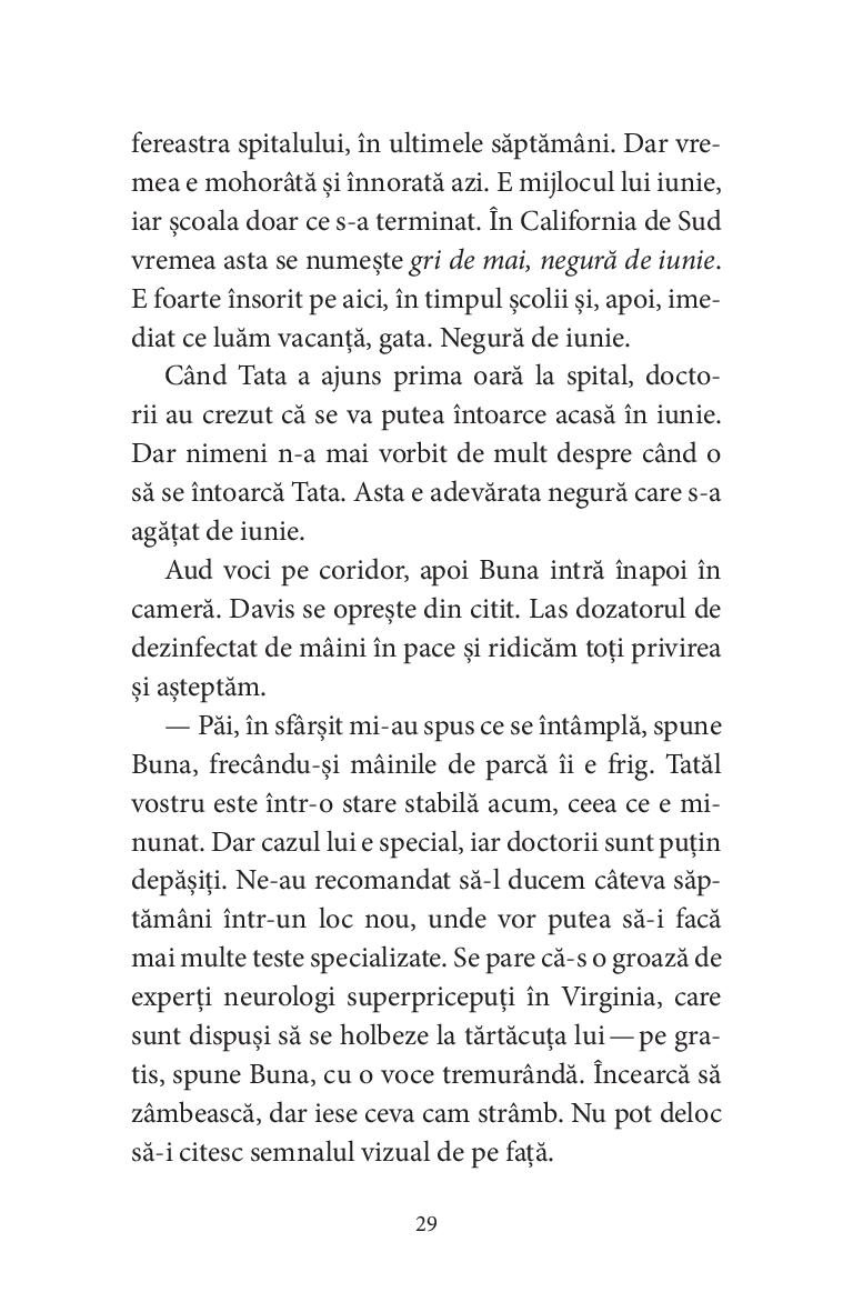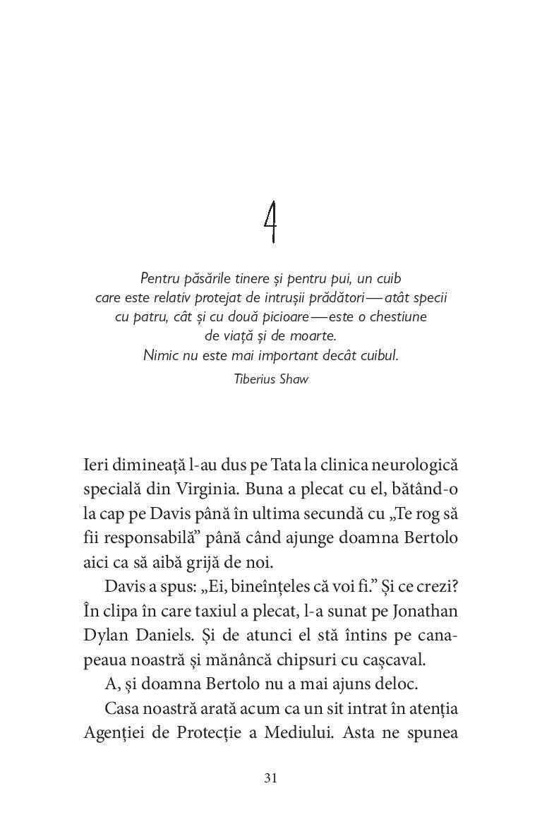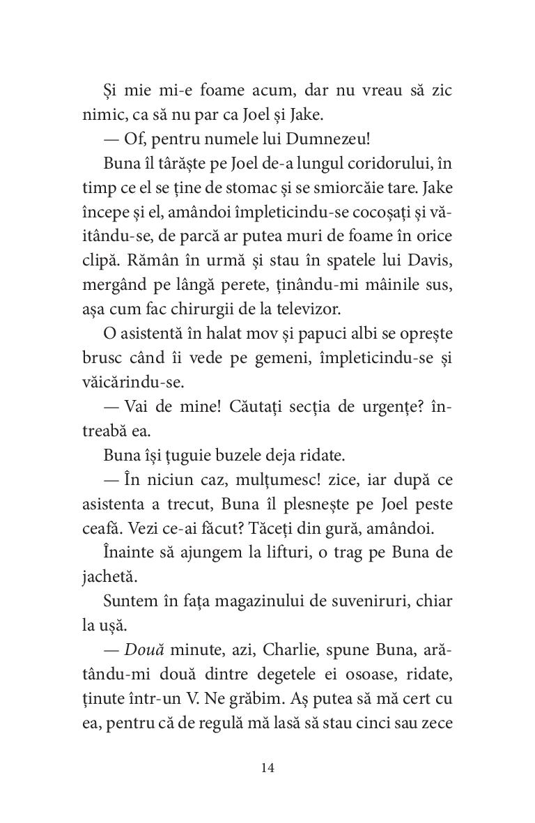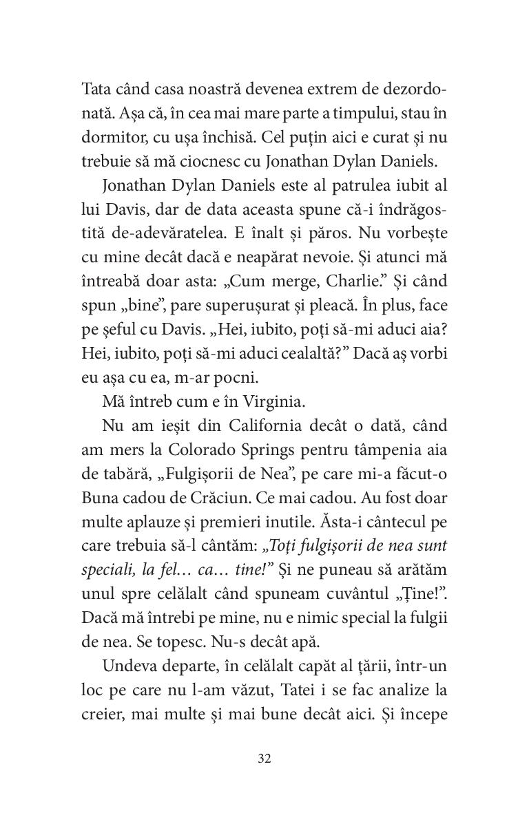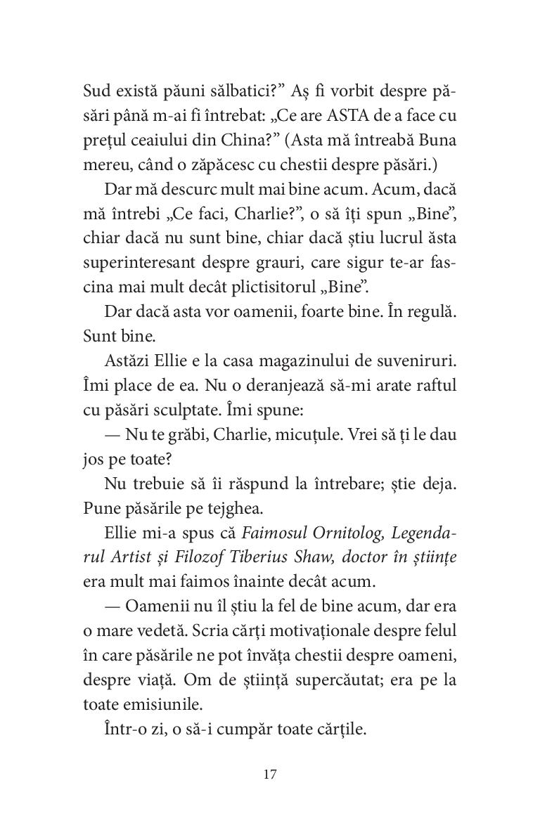 Camera lui Charlie e curată, caietele și creioanele stau aliniate frumos, iar el se simte bine și în siguranță urmându-si neabătut obiceiurile. Dar această viață perfect organizată este dată peste cap de când tatăl lui Charlie, reporter de război, s-a întors rănit din Afghanistan. Când doctorii decid că tatăl său trebuie mutat într-un spital din Virginia, Charlie, care este pasionat de păsări, acceptă să plece într-o lungă și solicitantă călătorie. Urăște călătoriile, dar știe că uneori e mai bine să zboare alături de stol, chiar când stolul e format din frații săi gemeni, obraznici și agitați, o soră mai mare, adolescentă, care e tot timpul cu ochii după băieți, și, apărută ca din senin, o ciudată care poartă o perucă liliachie.