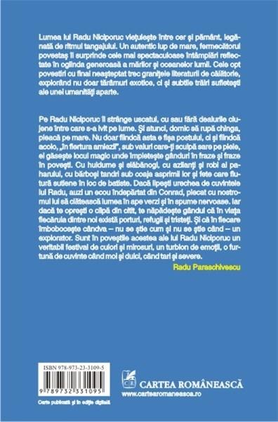 Lumea lui Radu Niciporuc vietuieste intre cer si pamint, leganata de ritmul tangajului. Un autentic lup de mare, fermecatorul povestas ii surprinde cele mai spectaculoase intimplari reflectate in oglinda generoasa a marilor si oceanelor lumii. Cele opt povestiri cu final neasteptat trec granitele literaturii de calatorie, explorind nu doar tarimuri exotice, ci si subtile trairi sufletesti ale unei umanitati aparte.
