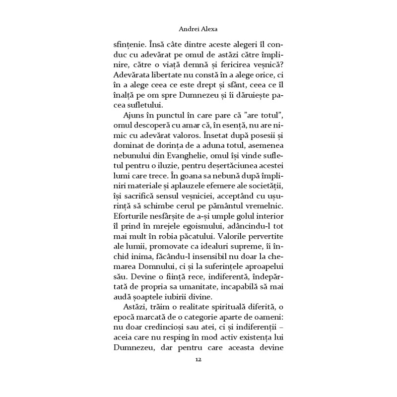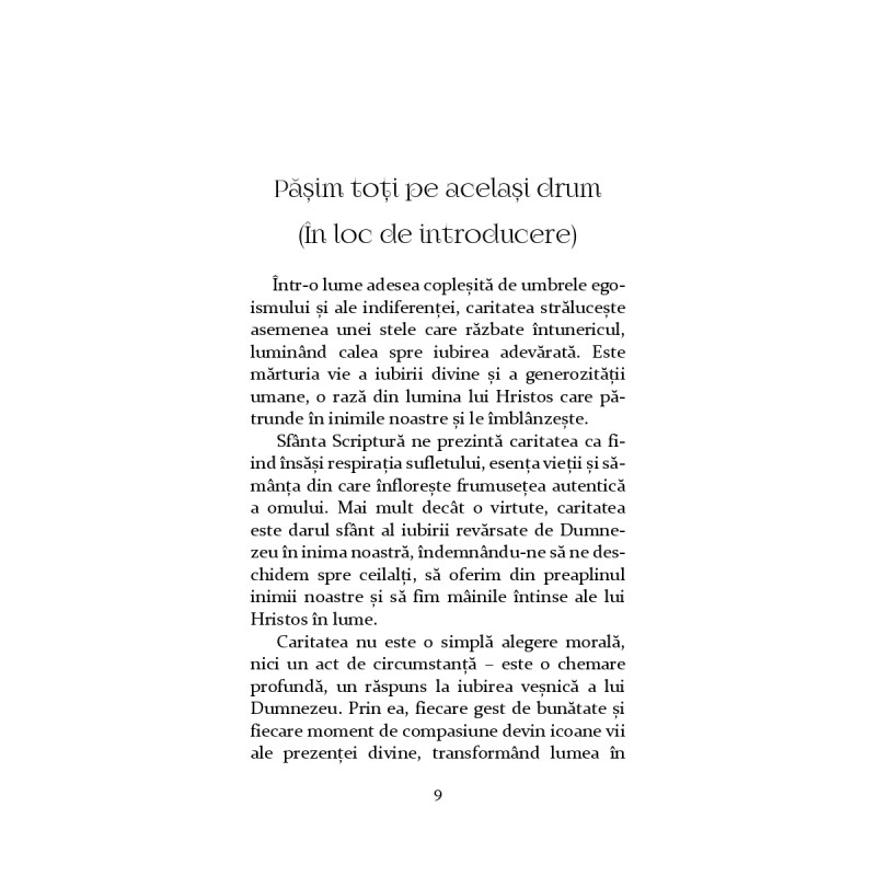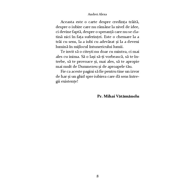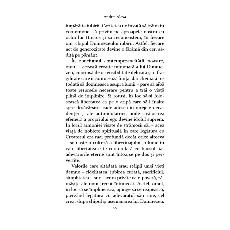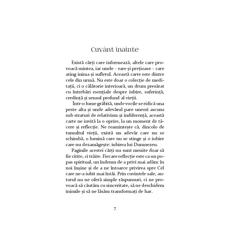Există cărţi care informează, altele care provoacă mintea, iar unele - rare şi prețioase - care ating inima şi sufletul. Această carte este dintre cele din urmă. Nu este doar o colectie de meditații, ci o călătorie interioară, un drum presărat cu întrebări esenţiale despre iubire, suferinţă, credinţă şi sensul profund al vieţii. Într-o lume grăbită, unde vocile se ridică una peste alta şi unde adevărul pare uneori ascuns sub straturi de relativism şi indiferenţă, această carte ne invită la o oprire, la un moment de tăcere şi reflectie. Ne reaminteste că, dincolo de tumultul vietții, există un adevär care nu se schimbă, o lumină care nu se stinge și o iubire care nu dezamăgeşte: iubirea lui Dumnezeu. - Pr. Mihai Vătămănelu