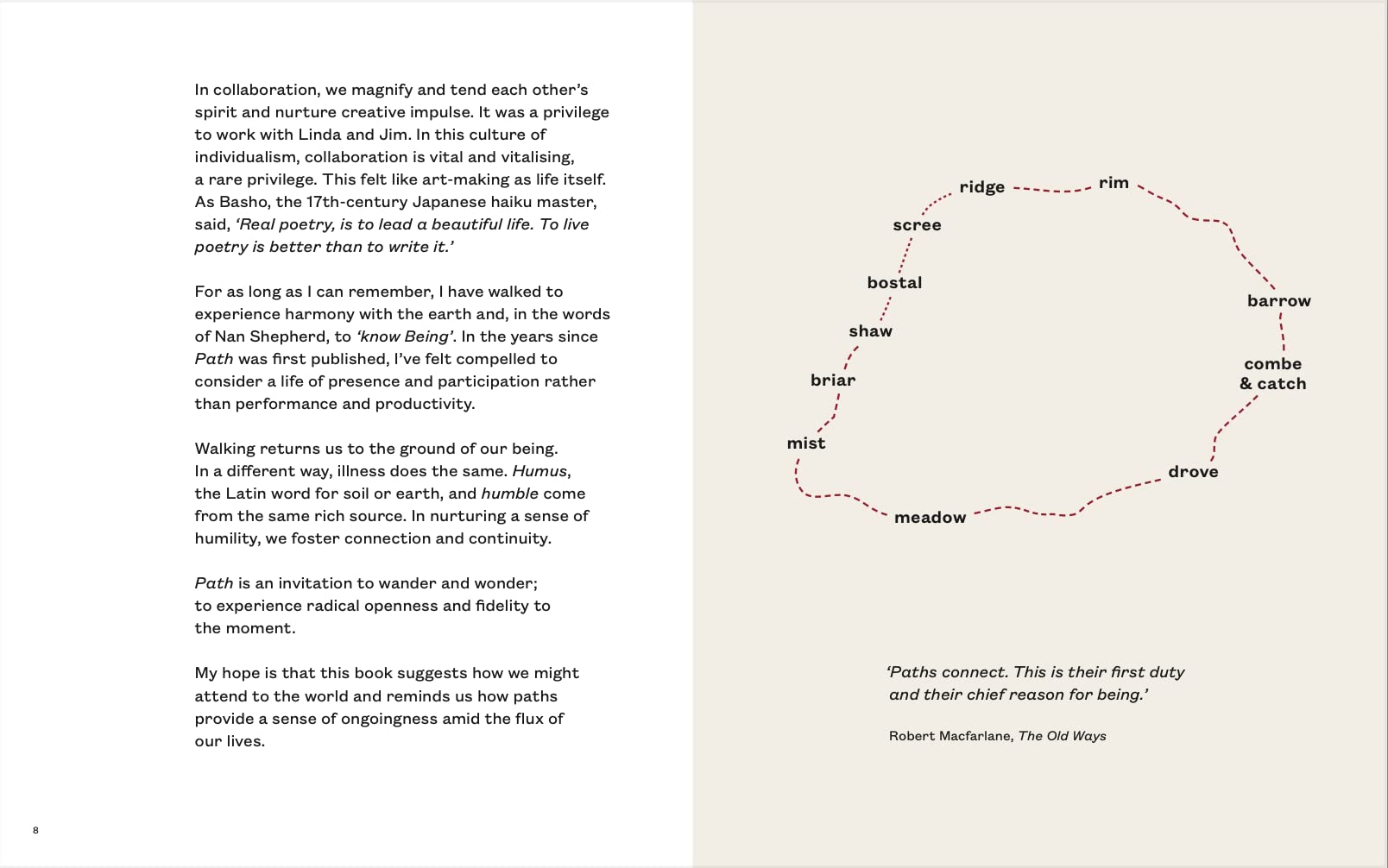 A solitary figure walks along ancient pathways, between slender trees, across open hills. They walk through isolation and uncertainty towards an understanding that they are not alone, but part of the world. Interconnected and interdependent. Path is a meditative journey in lyrical prose, evocative photography and original artworks that captures the beauty and endurance of the landscape, and the natural rhythm of walking, as the earth itself offers up support and reassurance. Positive and life-affirming, Path is an invitation to experience aliveness and moments of connection.