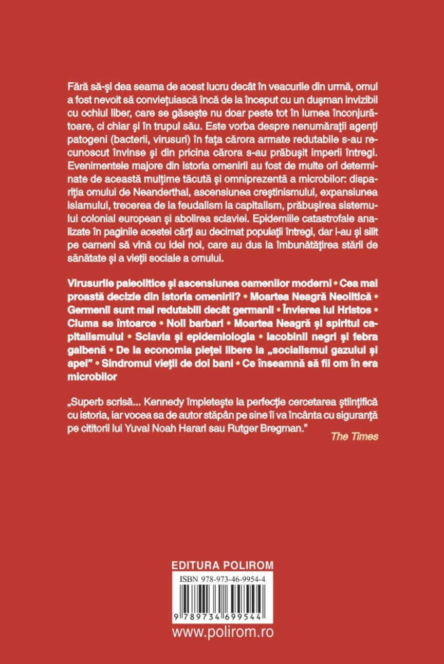 Este vorba despre nenumărații agenți patogeni (bacterii, virusuri) în fața cărora armate redutabile s-au recunoscut învinse și din pricina cărora s-au prăbușit imperii întregi. Evenimentele majore din istoria omenirii au fost de multe ori determinate de această mulțime tăcută și omniprezentă a microbilor: dispariția omului de Neanderthal, ascensiunea creștinismului, expansiunea islamului, trecerea de la feudalism la capitalism, prăbușirea sistemului colonial european și abolirea sclaviei. Epidemiile catastrofale analizate în paginile acestei cărți au decimat populații întregi, dar i-au și silit pe oameni să vină cu idei noi, care au dus la îmbunătățirea stării de sănătate și a vieții sociale a omului.