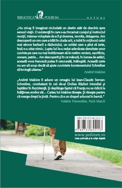 „Nu mi-as fi imaginat niciodata un destin atit de deschis spre sensul vietii. O existenta in care s-au incarnat curajul si instinctul mortii, intensa voluptate de a fi si durerea, revolta, detasarea. Am descoperit un om care a trait in ciuda urii, a iubit in mijlocul celei mai atroce barbarii a razboiului, un soldat care a stiut sa ierte, insa n-a uitat nimic. Lupta lui le-a redat adevarata densitate unor cuvinte pe care nu mai indrazneam sa le rostim: eroism, sacrificiu, onoare, patrie… Am descoperit si in ce masura, in lumea de astazi, aceasta voce franceza putea fi cenzurata, inabusita. Aceasta carte nu are alt scop decit sa ajute cuvintele locotenentului Schreiber sa invinga uitarea.” (Andrei Makine)