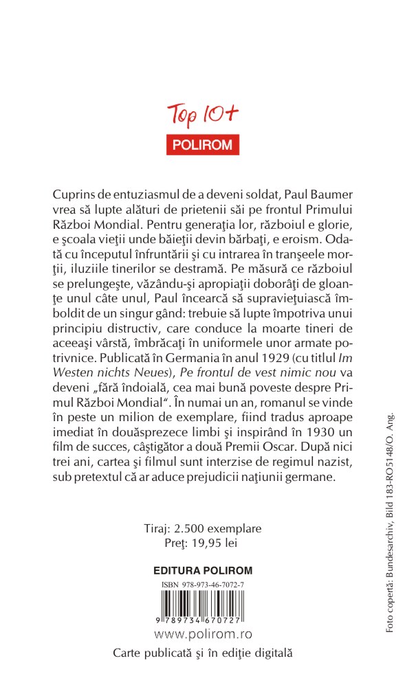 Cuprins de entuziasmul de a deveni soldat, Paul Baumer vrea să lupte alături de prietenii săi pe frontul Primului Război Mondial. Pentru generaţia lor, războiul e glorie, e şcoala vieţii unde băieţii devin bărbaţi, e eroism. Odată cu începutul înfruntării şi cu intrarea în tranşeele morţii, iluziile tinerilor se destramă. Pe măsură ce războiul se prelungeşte, văzîndu-şi apropiaţii doborîţi de gloanţe unul cîte unul, Paul încearcă să supravieţuiască îmboldit de un singur gînd: trebuie să lupte împotriva unui principiu distructiv, care conduce la moarte tineri de aceeaşi vîrstă, îmbrăcaţi în uniformele unor armate potrivnice. Publicată în Germania în anul 1929 (cu titlul Im Westen nichts Neues), Pe frontul de vest nimic nou va deveni „fără îndoială, cea mai bună poveste despre Primul Război Mondial”. În numai un an, romanul se vinde în peste un milion de exemplare, fiind tradus aproape imediat în douăsprezece limbi şi inspirînd în 1930 un film de succes, cîştigător a două Premii Oscar. După nici trei ani, cartea şi filmul sînt interzise de regimul nazist, sub pretextul că ar aduce prejudicii naţiunii germane.