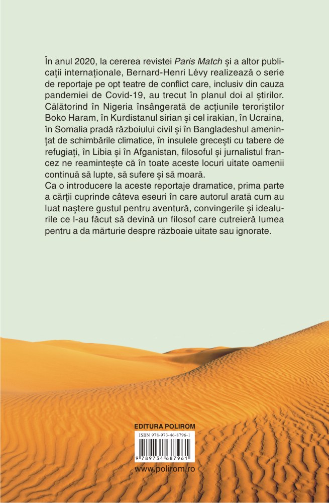 În anul 2020, la cererea revistei Paris Match și a altor publicații internaționale, Bernard-Henri Lévy realizează o serie de reportaje pe opt teatre de conflict care, inclusiv din cauza pandemiei de Covid-19, au trecut în planul doi al știrilor. Călătorind în Nigeria însângerată de acțiunile teroriștilor Boko Haram, în Kurdistanul sirian și cel irakian, în Ucraina, în Somalia pradă războiului civil și în Bangladeshul amenințat de schimbările climatice, în insulele grecești cu tabere de refugiați, în Libia și în Afganistan, filosoful și jurnalistul francez ne reamintește că în toate aceste locuri uitate oamenii continuă să lupte, să sufere și să moară.