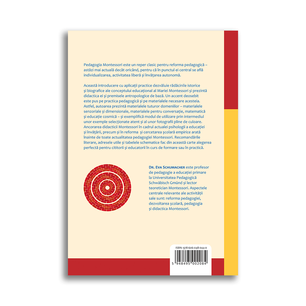 Această introducere cu aplicații practice dezvăluie rădăcinile istorice și biografice ale conceptului educațional al Mariei Montessori și prezintă didactica ei și premisele antropologice de bază. Un accent deosebit este pus pe practica pedagogică și pe materialele necesare acesteia. Astfel, autoarea prezintă materialele tuturor domeniilor – materialele senzoriale și dimensionale, materialele pentru conversație, matematică și educație cosmică – și exemplifică modul de utilizare prin intermediul unor exemple selecționate atent și al unor fotografii pline de culoare. Ancorarea didacticii Montessori în cadrul actualei psihologii a educației și învățării, precum și în reforma și cercetarea școlară empirice arată înainte de toate actualitatea pedagogiei Montessori. Recomandările literare, adresele utile și tabletele schematice fac din această carte alegerea perfectă pentru cititorii și educatorii în curs de formare sau în practică.