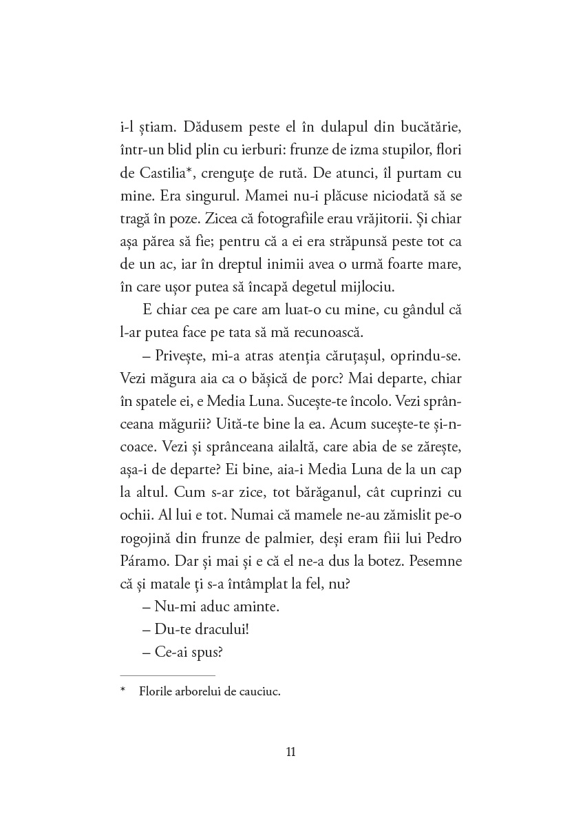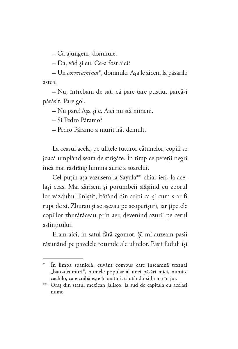 JUAN RULFO (1917–1986) este unul dintre cei mai apreciați scriitori latino-americani. A susținut arta în toate formele ei și a reprezentat un sprijin important pentru tinerii scriitori latino-americani prin intermediul Centro Mexicano de Escritores. A fost funcționar public; purtător de cuvânt al Comisión del Papaloapan și consilier în diverse proiecte cinematografice și editoriale. Cea mai lungă perioadă și-a petrecut-o în Departamento de Publicaciones del extinto Instituto Nacional Indigenista, unde a susținut publicarea și traducerea unui număr mare de monografii despre plurietnicitatea Mexicului și opere clasice de antropologie mexicană. Din anii ’30 până în anii ’60 s-a dedicat și fotografiei, având un palmares de peste 6000 de negative. Cele trei cărți publicate, El llano en llamas (în curs de apariție la Curtea Veche Publishing, traducere de Andrei Ionescu), Pedro Páramo și El gallo de oro (în curs de apariție la Curtea Veche Publishing, traducere de Ileana Scipione), au fost traduse în peste 40 de limbi.