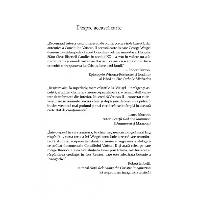 George Weigel propune mai mult de treizeci de ani de cercetare a realităților catolice globale în această reevaluare convingătoare, explicând necesitatea Conciliului Vatican II și explorând relevanța continuă a învăţăturii sale într-o lume care caută experiența mai profundă a libertății decât voinţa personală.