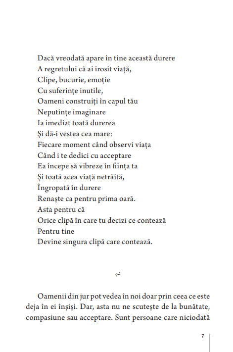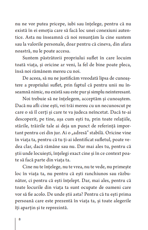 Atunci cand sufletul doare, te intorci la el. Iți iei sufletul in brațe, și incepi sa cauți motivul durerii, pentru ca acolo e raspunsul. Viața te doare nu pentru ca ai suflet, ci pentru ca sufletul tau a fost abandonat, abuzat, ignorat, chiar de catre tine, cel care acum are nevoie de iubirea lui. Da, avem nevoie sa ii caștigam increderea sufletului nostru, avem nevoie sa cunoaștem tot ce suntem, toate parțile emoției și trairii noastre, ca sa putem trai cu noi. Odata identificat, revendicat și vindecat, sufletul iți rezolva orice problema, te indruma daca ești pierdut, te apara de neiubire și te reconstruiește ca identitate emoționala. Ai din nou viața in tine, incepi sa vezi clar, sa gandești limpede, sa te insanatoșești, atunci cand ai sufletul de partea ta, cand l-ai invațat cum sa te vindece, și nu cum sa te doara mai tare.