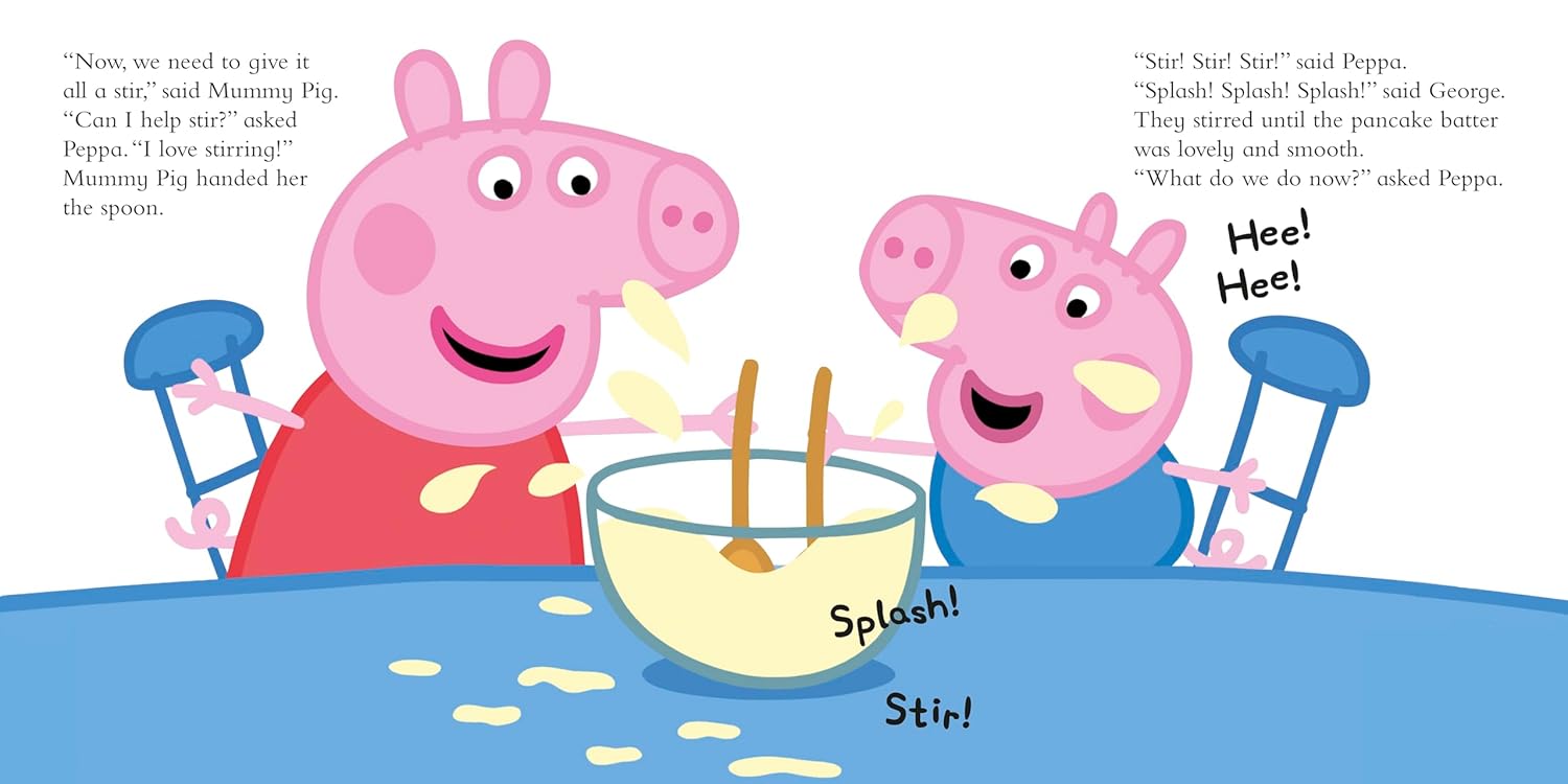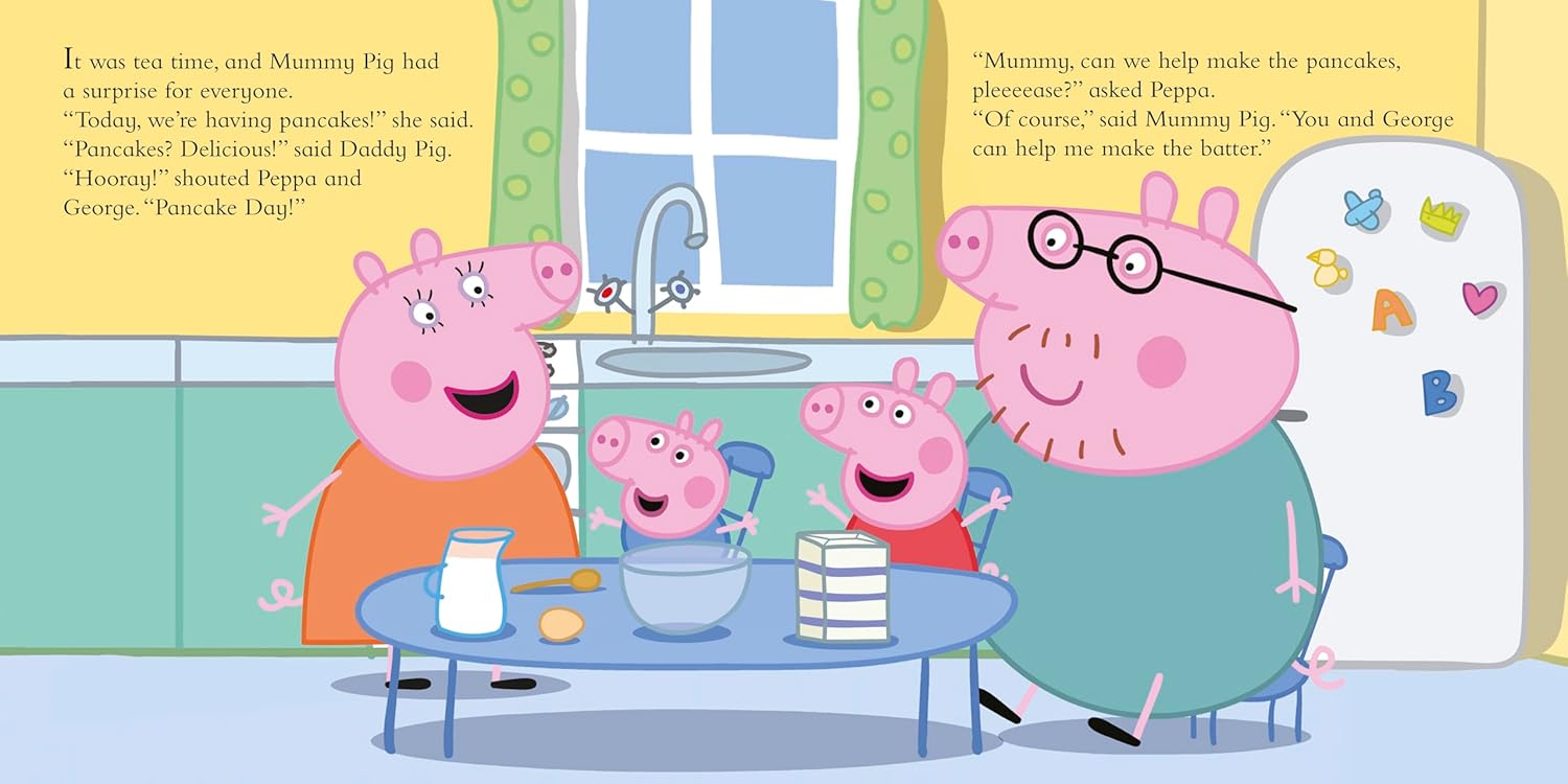 It’s Pancake Day! Peppa and George are excited to make yummy pancakes with Mummy and Daddy Pig! But when Daddy Pig flips his pancake, it flies really high into the air and gets stuck to the ceiling! How will they get it down again?