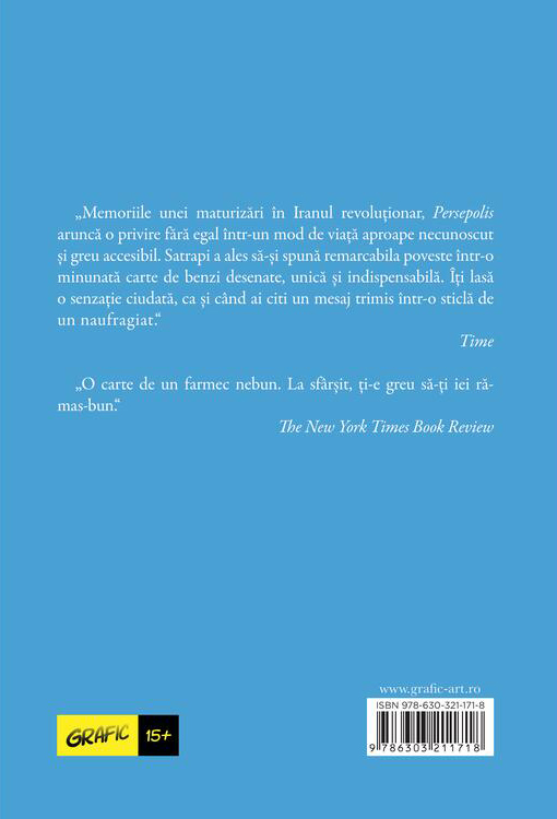 „O carte de un farmec nebun. La sfârşit, ţi-e greu să-ţi iei rămas-bun.“ The New York Times Book Review„Memoriile unei maturizări în Iranul revoluţionar, Persepolis aruncă o privire fără egal într-un mod de viaţă aproape necunoscut şi greu accesibil. Satrapi a ales să-şi spună remarcabila poveste într-o minunată carte de benzi desenate, unică şi indispensabilă. Îţi lasă o senzaţie ciudată, ca şi când ai citi un mesaj trimis într-o sticlă de un naufragiat.“ Time