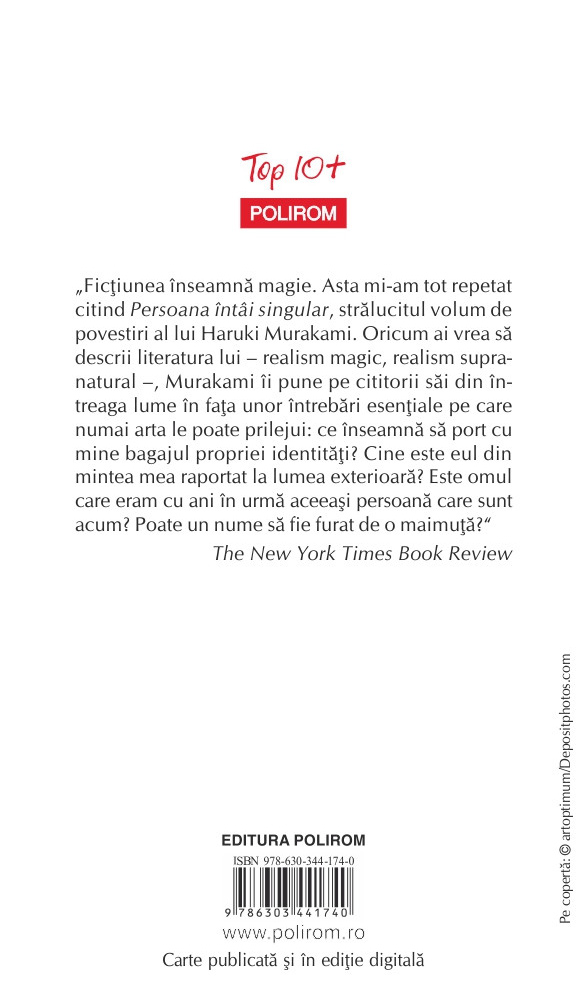 „Ficţiunea înseamnă magie. Asta mi-am tot repetat citind Persoana întâi singular, strălucitul volum de povestiri al lui Haruki Murakami. Oricum ai vrea să descrii literatura lui – realism magic, realism supranatural –, Murakami îi pune pe cititorii săi din întreaga lume în faţa unor întrebări esenţiale pe care numai arta le poate prilejui: ce înseamnă să port cu mine bagajul propriei identităţi? Cine este eul din mintea mea raportat la lumea exterioară? Este omul care eram cu ani în urmă aceeaşi persoană care sunt acum? Poate un nume să fie furat de o maimuţă?” (The New York Times Book Review)