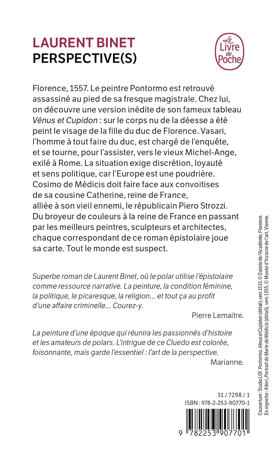 Florence, 1557. Le peintre Pontormo est retrouvé assassiné au pied de sa fresque magistrale. Chez lui, on découvre une version inédite de son fameux tableau Vénus et Cupidon : sur le corps nu de la déesse a été peint le visage de la fille du duc de Florence. Vasari, l’homme à tout faire du duc, est chargé de l’enquête, et se tourne, pour l’assister, vers le vieux Michel-Ange, exilé à Rome. La situation exige discrétion, loyauté et sens politique, car l’Europe est une poudrière. Cosimo de Médicis doit faire face aux convoitises de sa cousine Catherine, reine de France, alliée à son vieil ennemi, le républicain Piero Strozzi. Du broyeur de couleurs à la reine de France en passant par les meilleurs peintres, sculpteurs et architectes, chaque correspondant de ce roman épistolaire joue sa carte. Tout le monde est suspect.