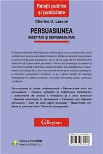 Pe fondul exploziei informationale, tehnologice si comunicationale, acest veritabil curs isi propune sa ne formeze in calitate de receptori responsabili si critici ai mesajelor persuasive, dar si sa ne ajute sa fim eficienti cind incercam sa ii persuadam pe ceilalti. Volumul se adreseaza studentilor si celor care lucreaza in domeniul relatiilor publice, al publicitatii sau in mass-media, furnizindu-le nu doar instrumente eficiente de analiza a strategiilor si tehnicilor persuasiunii moderne, ci si o gama variata de exemple interesante din mediul american, mai putin cunoscute, poate, publicului romanesc.
