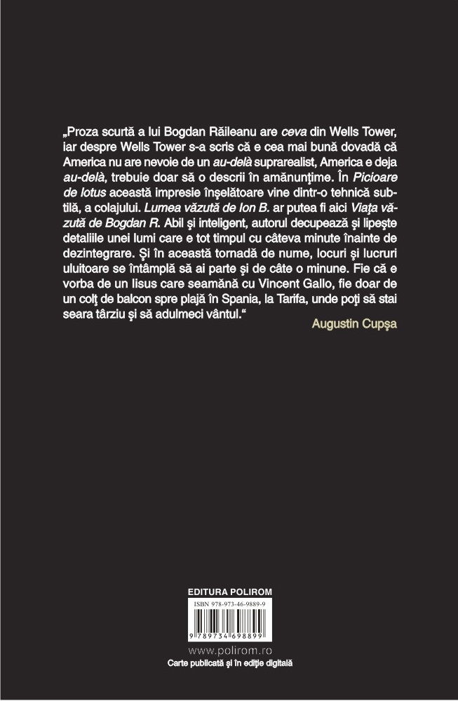 „Proza scurtă a lui Bogdan Răileanu are ceva din Wells Tower, iar despre Wells Tower s-a scris că e cea mai bună dovadă că America nu are nevoie de un au-delà suprarealist, America e deja au-delà, trebuie doar să o descrii în amănunțime. În Picioare de lotus această impresie înșelătoare vine dintr-o tehnică subtilă, a colajului.