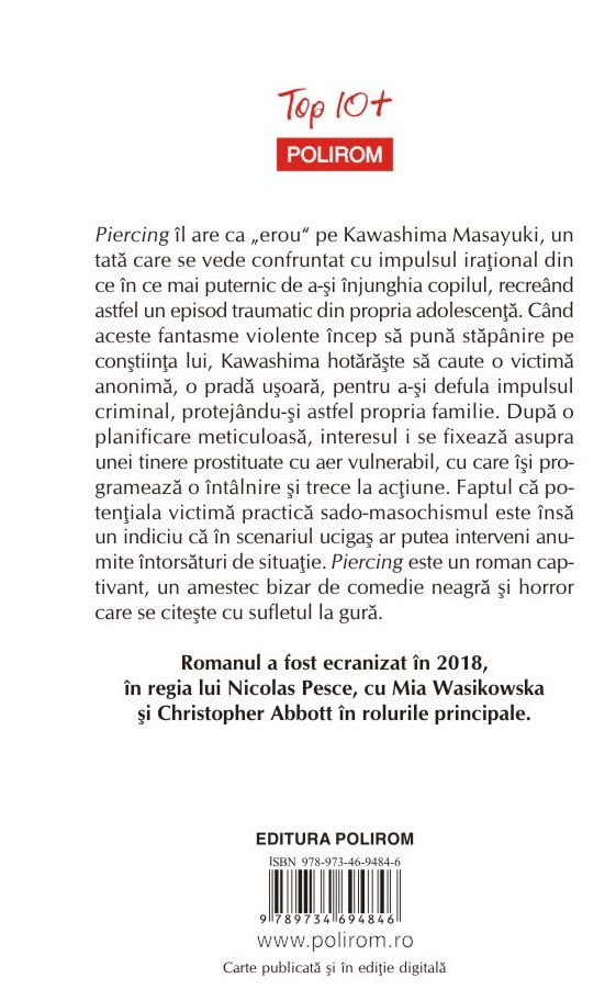 Piercing îl are ca „erou” pe Kawashima Masayuki, un tată care se vede confruntat cu impulsul iraţional din ce în ce mai puternic de a-şi înjunghia copilul, recreând astfel un episod traumatic din propria adolescenţă. Când aceste fantasme violente încep să pună stăpânire pe conştiinţa lui, Kawashima hotărăşte să caute o victimă anonimă, o pradă uşoară, pentru a-şi defula impulsul criminal, protejându-şi astfel propria familie. După o planificare meticuloasă, interesul i se fixează asupra unei tinere prostituate cu aer vulnerabil, cu care îşi programează o întâlnire şi trece la acţiune. Faptul că potenţiala victimă practică sado-masochismul este însă un indiciu că în scenariul ucigaş ar putea interveni anumite întorsături de situaţie. Piercing este un roman captivant, un amestec bizar de comedie neagră şi horror care se citeşte cu sufletul la gură.
