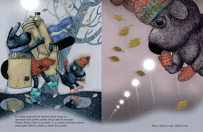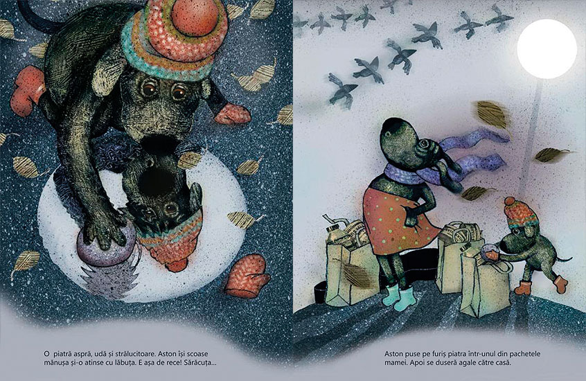 E o seară mohorâtă de toamnă târzie. Frigul se strecoară tiptil printre umbre. De pe alee se aud pași. Pleosc! Pleosc! Uite-l și pe Aston. E cu mama, care duce câteva plase grele. Brânză, spanac și pește de la piață. Brusc, Aston se oprește. A zărit ceva. O piatră aspră, udă și strălucitoare. Aston își scoase mănușa și-o atinse cu lăbuța. E așa de rece! Sărăcuța…