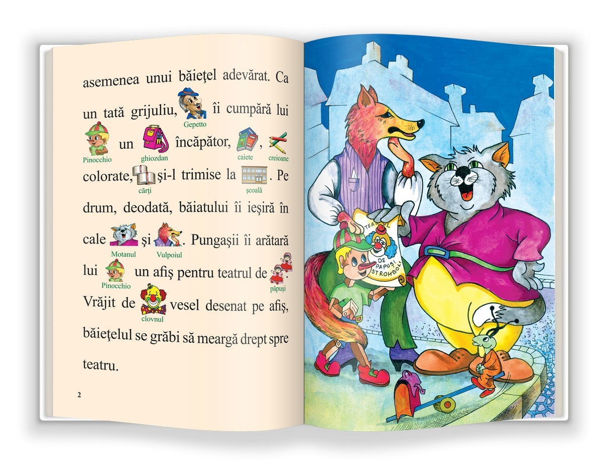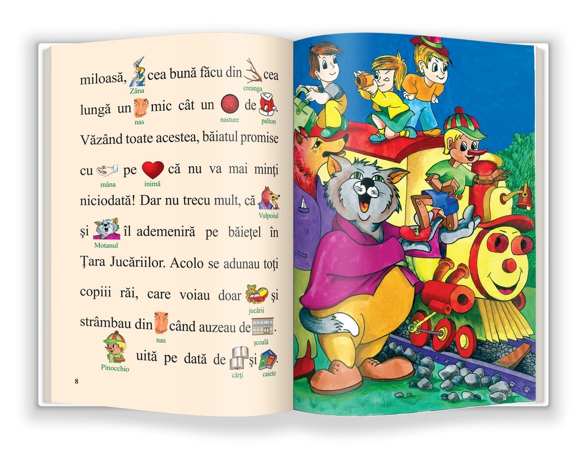 Cartea, repovestire după Carlo Collodi, include ilustrații deasupra cuvintelor, pentru a ușura asocierea cuvânt-sens. Cartea îl va ajuta pe copil să își exerseze citirea, iar ilustrațiile color și fontul de dimensiuni mari vor face ca textul să fie mai răsfirat și, implicit, ca lectura să fie mai atrăgătoare și mai ușor de parcurs. Cartea este destinată copiilor de 7-8 ani și face parte din colecția „Învăț să citesc! Nivelul 1”.