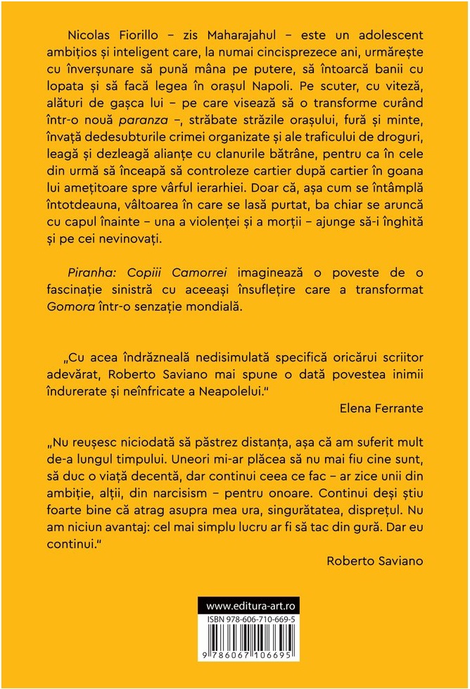 "Cu acea îndrăzneală nedisimulată specifică oricărui scriitor adevărat, Roberto Saviano mai spune o dată povestea inimii îndurerate și neînfricate a orașului Neapolelui." Elena Ferrante
