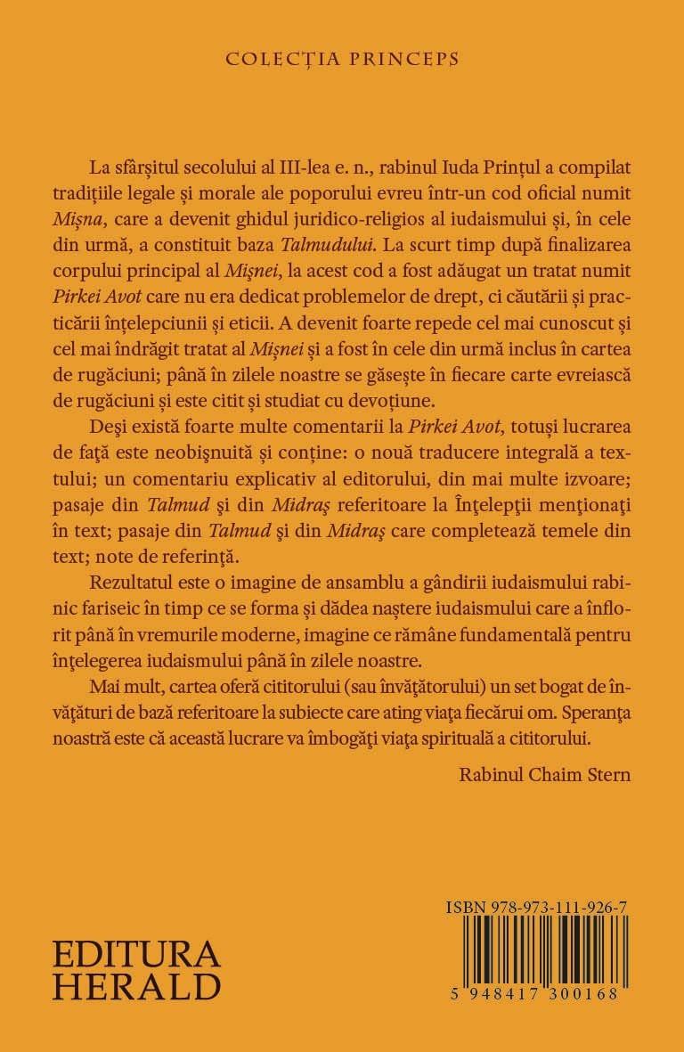 Desi exista foarte multe comentarii la Pirkei Avot, totusi lucrarea de fata este neobisnuita si contine: o noua traducere integrala a textului; un comentariu explicativ al editorului, din mai multe izvoare; pasaje din Talmud si din Midras referitoare la Inteleptii mentionati in text; pasaje din Talmud si din Midras care completeaza temele din