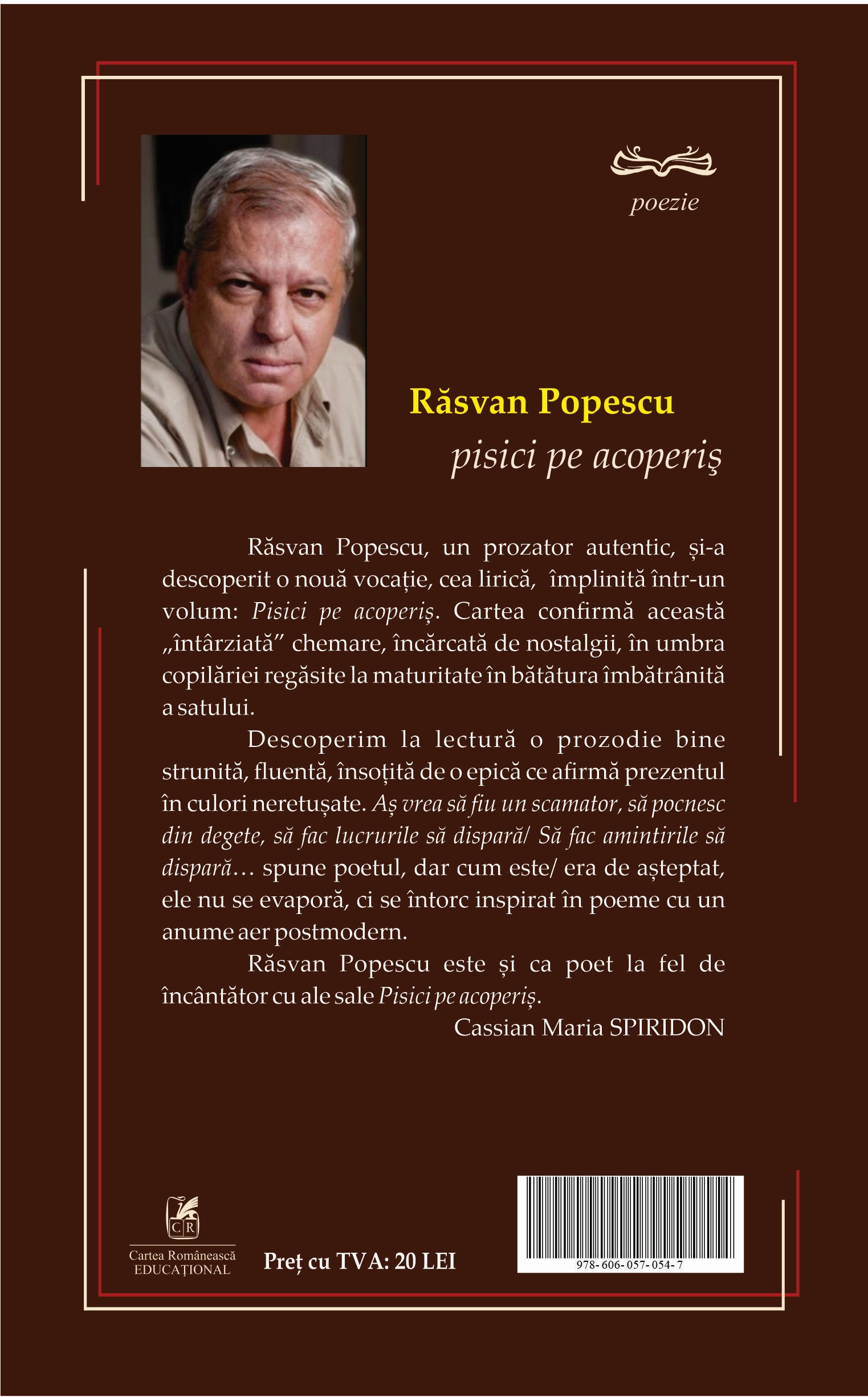 Răsvan Popescu, un prozator autentic, și-a descoperit o nouă vocație, cea lirică; împlinită într-un volum: Pisici pe acoperiș. Cartea confirmă această „întîrziată” chemare, încărcată de nostalgii, în umbra copilăriei regăsită la maturitate în bătătura îmbătrînită a satului.