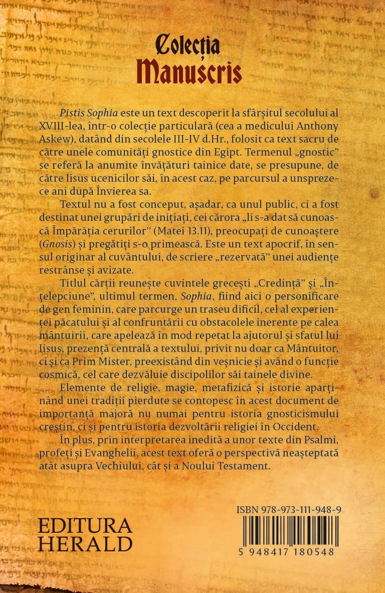 Pistis Sophia este un text descoperit la sfarsitul secolului al XVIII-lea, intr-o colectie particulara (cea a medicului Anthony Askew), datand din secolele III-IV d.Hr., folosit ca text sacru de catre unele comunitati gnostice din Egipt. Termenul „gnostic” se refera la anumite invataturi tainice date, se presupune, de catre Iisus ucenicilor sai, in acest caz, pe parcursul a unsprezece ani dupa Invierea sa.