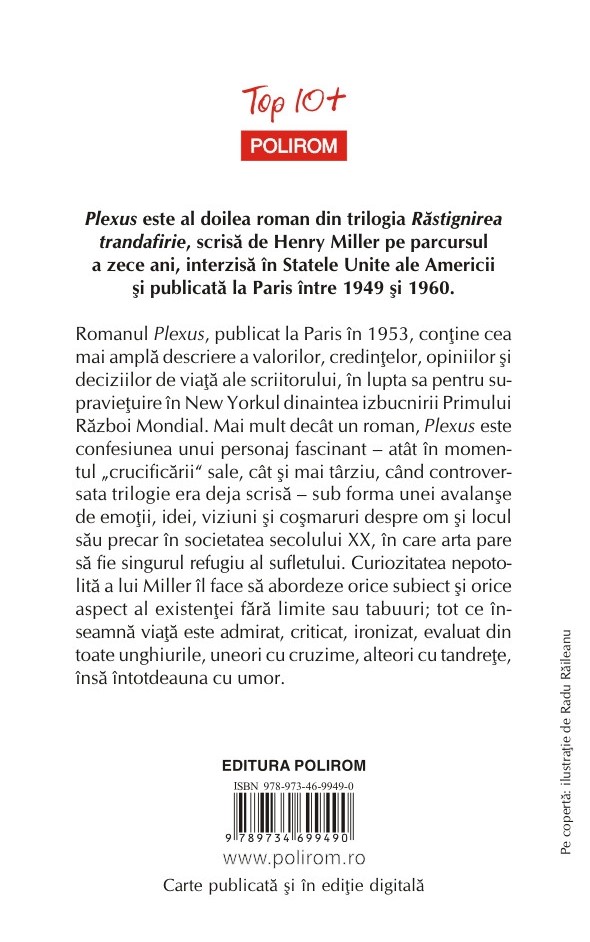 Romanul Plexus, publicat la Paris în 1953, conţine cea mai amplă descriere a valorilor, credinţelor, opiniilor şi deciziilor de viaţă ale scriitorului, în lupta sa pentru su-pravieţuire în New Yorkul dinaintea izbucnirii Primului Război Mondial. Mai mult decât un roman, Plexus este confesiunea unui personaj fascinant – atât în momentul „crucificării” sale, cât şi mai târziu, când controversata trilogie era deja scrisă – sub forma unei avalanşe de emoţii, idei, viziuni şi coşmaruri despre om şi locul său precar în societatea secolului XX, în care arta pare să fie singurul refugiu al sufletului. Curiozitatea nepotolită a lui Miller îl face să abordeze orice subiect şi orice aspect al existenţei fără limite sau tabuuri; tot ce înseamnă viaţă este admirat, criticat, ironizat, evaluat din toate unghiurile, uneori cu cruzime, alteori cu tandreţe, însă întotdeauna cu umor.