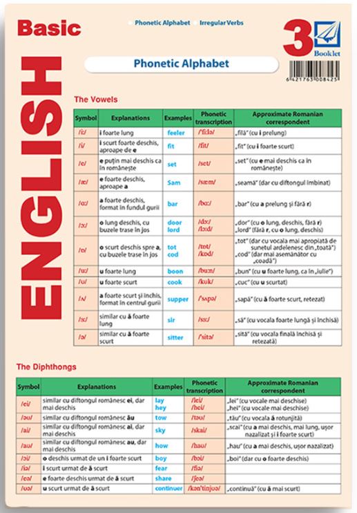 Pliantul conţine noțiuni gramaticale despre: Alfabetul fonetic, Verbele neregulate.