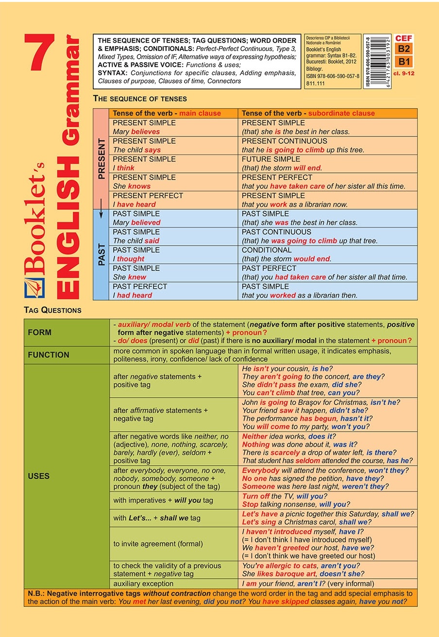 Pliantul English Grammar 7 acopera sub forma de sinteza elemente de gramatica prevazute in programa scolara pentru liceu (verbul si determinantii sai) si vizeaza nivelul B1-B2 conform cadrului comun european de referinta pentru limbile straine.