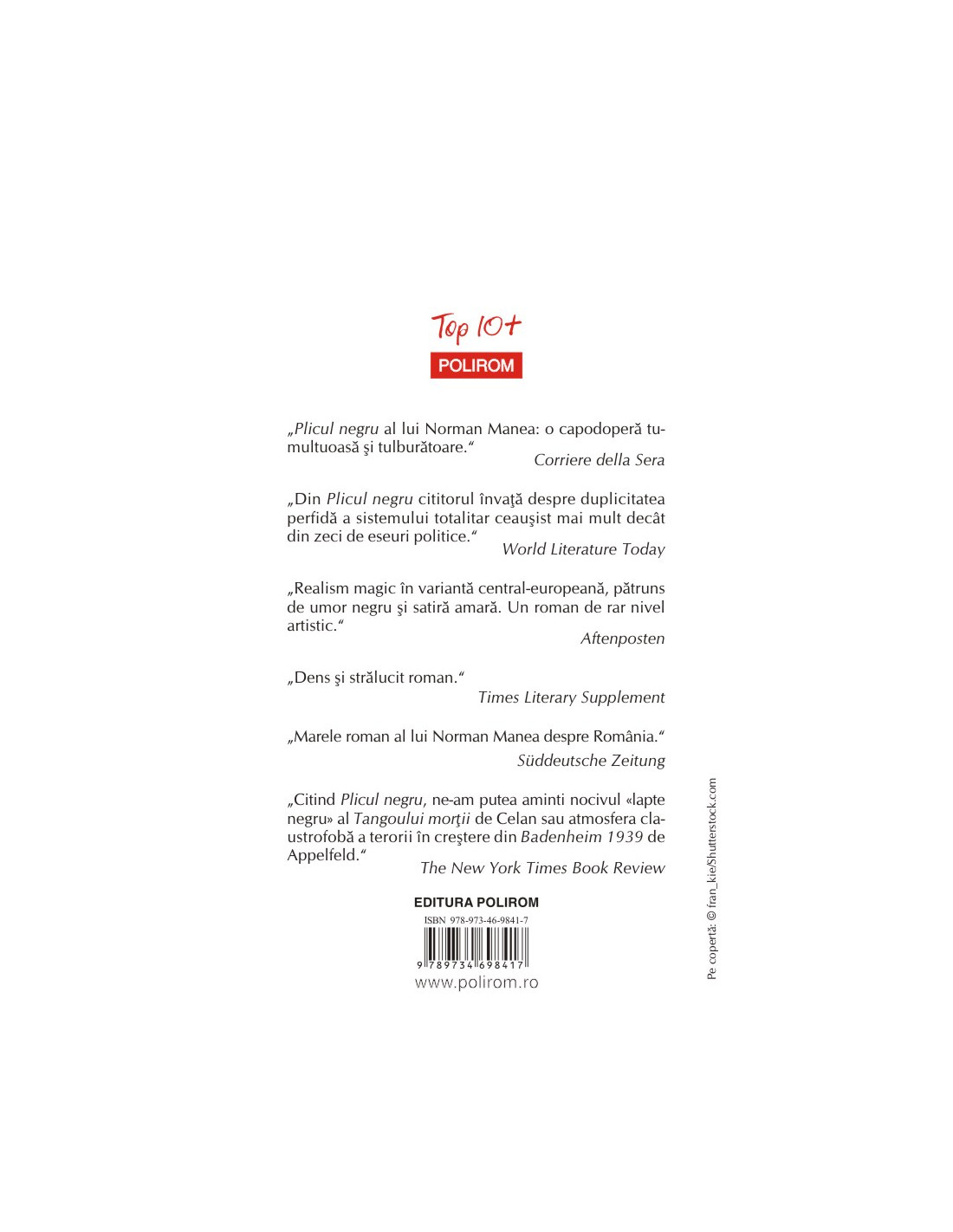 „Plicul negru al lui Norman Manea: o capodoperă tumultuoasă şi tulburătoare.” (Corriere della Sera)