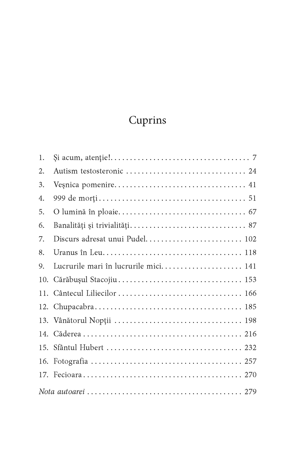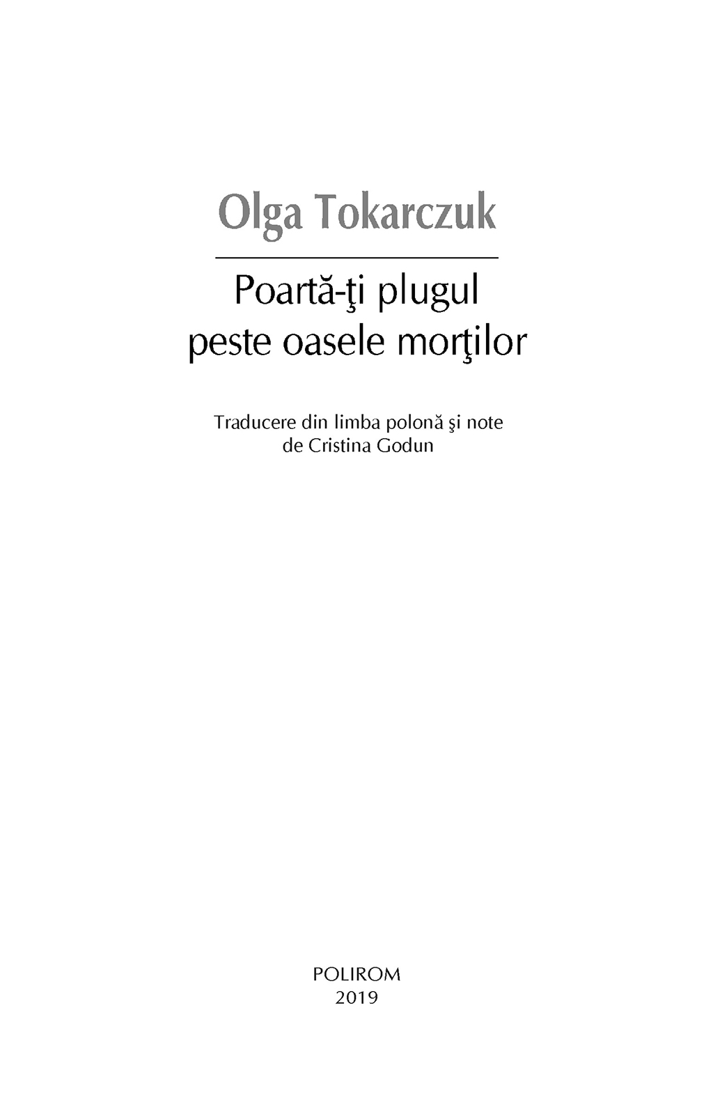 Într-un cătun de la graniţa Poloniei cu Cehia, unde trăiesc aproape izolaţi de lume un grup de localnici şi cîţiva proprietari ai unor case de vacanţă, au loc o serie de crime. Victimele se dovedesc a fi vînători pasionaţi, iar dacă e să ascultăm opinia bătrînei doamne Duszejko, a cărei voce spune întreaga poveste, animalele sălbatice nu sînt tocmai străine de crime. Însă doamna Duszejko, o apărătoare a animalelor, e ea însăşi un personaj ciudat: profesoară de engleză pensionară, pasionată de astrologie şi, în acelaşi timp, de poezia lui William Blake, ale cărui versuri apocaliptice apar ca un laitmotiv în întregul volum. Intriga poliţistă şi atmosfera mistică şi misterioasă sînt ţesute pe un decor contemporan familiar, cel al lumii postcomuniste din Europa de Est, o lume coruptă, obsedată de bani şi de prestigiu social. Nu lipsită de o doză de umor şi ironie insinuată abil, Poartă-ţi plugul peste oasele morţilor este un nou tur de forţă al remarcabilei prozatoare poloneze.