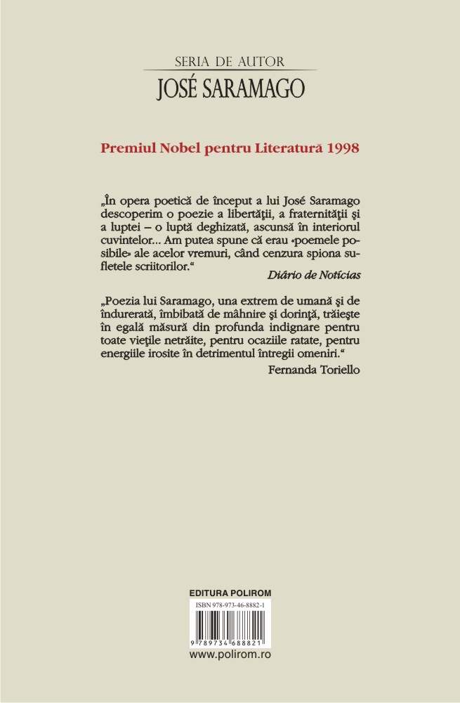 „În opera poetică de început a lui José Saramago descoperim o poezie a libertății, a fraternității și a luptei – o luptă deghizată, ascunsă în interiorul cuvintelor... Am putea spune că erau «poemele posibile» ale acelor vremuri, când cenzura spiona sufletele scriitorilor.” (Diário de Notícias)