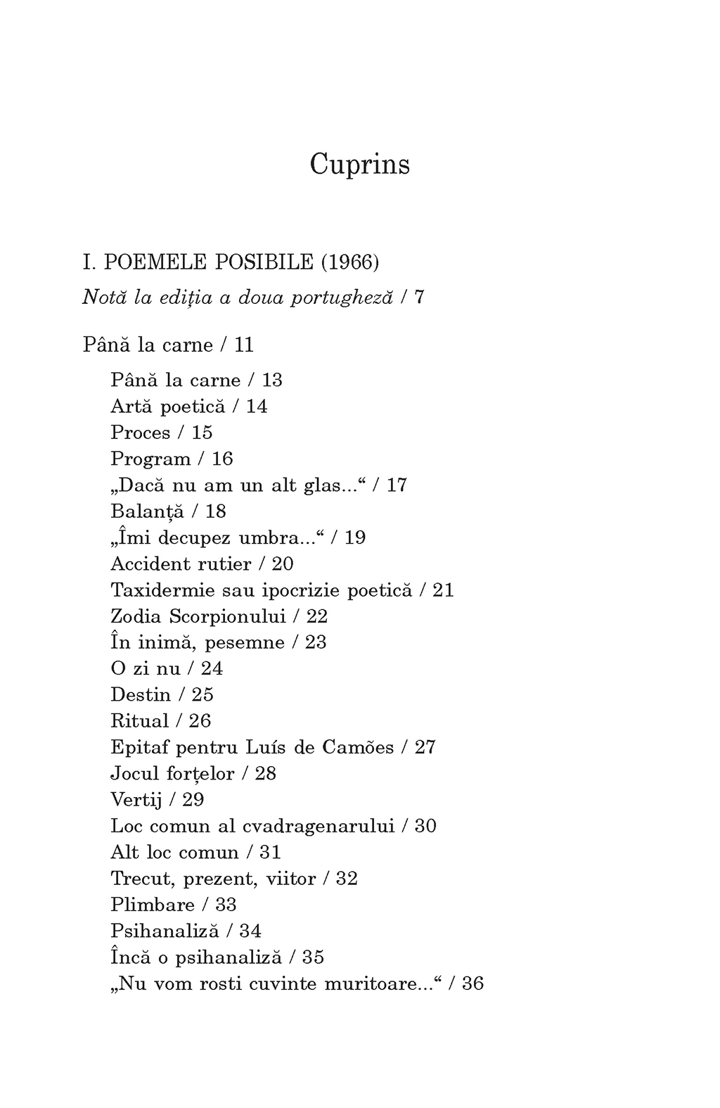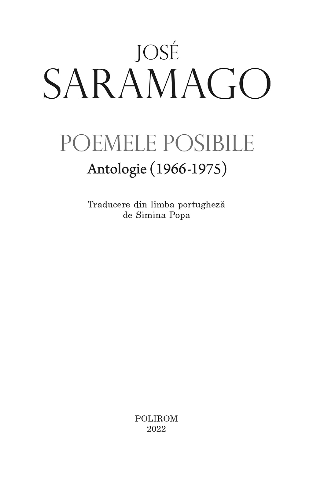 Cartea de faţă cuprinde cele trei volume de poezie scrise de José Saramago înainte de consacrarea sa ca autor, stabilită convenţional de critica literară la momentul publicării romanului Ridicat de la pământ, în 1980. Primul volum, Poemele posibile, care dă şi titlul ediţiei româneşti, apare în anul 1966, când Saramago avea 44 de ani, şi marchează revenirea scriitorului în lumea literară portugheză după o absenţă de 19 ani. Volumul este în sine o antologie, cu un cuprins dens şi generos în stiluri, rime şi endecasilabi, tradus în forma sa revizuită şi adăugită de Saramago cu ocazia ediţiilor ulterioare. Atât în acest volum, cât şi în cel de‑al doilea, Probabil bucurie (1970), cititorii vor recunoaşte picături din temele predilecte în romanele sale de mai târziu: trecerea timpului, duplicitatea sinelui, referinţe literare şi istorice, confruntarea divinităţii, frământările creaţiei. La scurt timp după revoluţia portugheză din 1974, Saramago publică Anul 1993, care îi încheie opera poetică. Este un poem narativ hibrid, dedicat suferinţei colective pricinuite de cei aproape 40 de ani de dictatură. Rigurozitatea termenilor, abdicarea de la punctuaţie, conturarea personajelor lasă deja să se întrevadă seria de romane care va începe doi ani mai târziu cu Manual de pictură şi caligrafie.