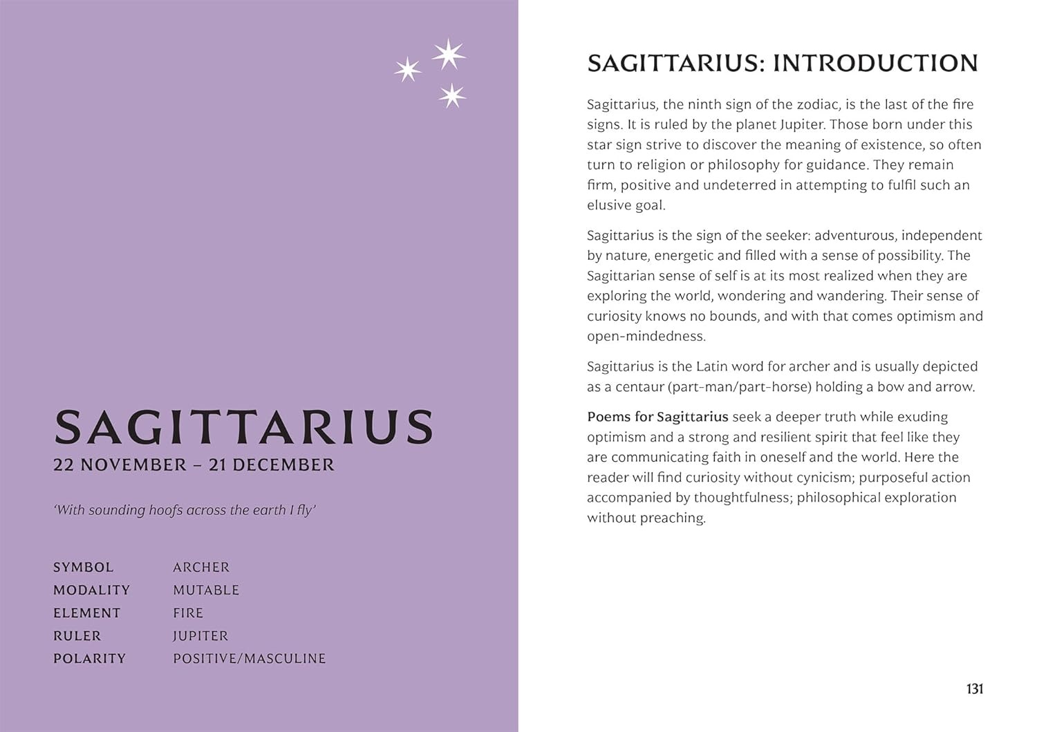 Included are some of our greatest writers – both classic and contemporary – from Ptolemy and Rainer Maria Rilke to Langston Hughes and Jane Hirshfield, all casting light on the personal, the mysterious, the celestial and the universal. Each chapter includes around 10 poems as well as a short introduction to the star sign, making the collection accessible to those less familiar with the subject and those who are curious to learn more.