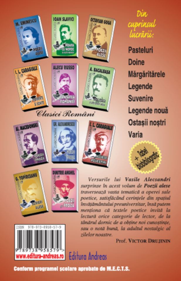 Desfasurarea existentei în cercul strâmt între viata si moarte pastreaza constiinta treaza unui popor, a unei natiuni în concertul culturii universale. Colectia "Clasici români" nu face altceva decât sa reînvie câteva dintre cele mai importante creatii artistice ale celor ce au plasat valorile nationale în context universal si sa refaca astfel geneza si moartea, pentru a se pastra vie viata spirituala. Volumul "Poezii alese" semnate de Vasile Alecsandri, prin structura lui, cuprinde grupajele de poezii intitulate pe rând "Pasteluri", "Doine", "Margaritarele", "Legende", "Legende noua", "Ostasii nostri", "Varia", "Suvenire", "Postume", grupând 55 de texte poetice. De asemenea, cartea cuprinde repere biobibliografice, unde sunt evidentiate câteva dintre cele mai importante momente ale vietii si creatiei lui Vasile Alecsandri. Grafica este în acord cu întreg continutul cartii, descoperindu-se cu fiecare pagina migala si talentul de artizan al poetului, care strabat timpul si reusesc sa-l învinga.