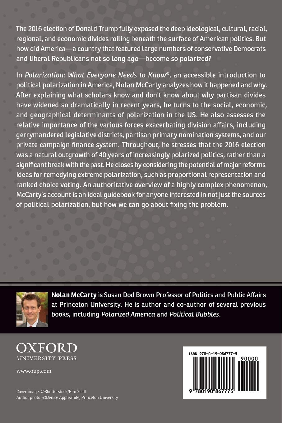 Nolan McCarty's Polarization: What Everyone Needs to Know® is an accessible introduction to polarization in America. McCarty takes readers through what scholars know and don't know about the origins, development, and implications of our rising political conflicts, delving into social, economic, and geographic determinants of polarization in the United States. While the current political climate makes it clear that extreme views are becoming more popular, McCarty also argues that, contrary to popular belief, the 2016 election was a natural outgrowth of 40 years of polarized politics, instead of a significant break with the past. He explains the factors that have created this state of affairs, including gerrymandered legislative districts, partisan primary nomination systems, and our private campaign finance system. He also considers the potential of major reforms such as instating proportional representation or single-transferable voting to remedy extreme polarization. A concise overview of a complex and crucial topic in US politics, this book is for anyone wanting to understand how to repair the cracks in our system.