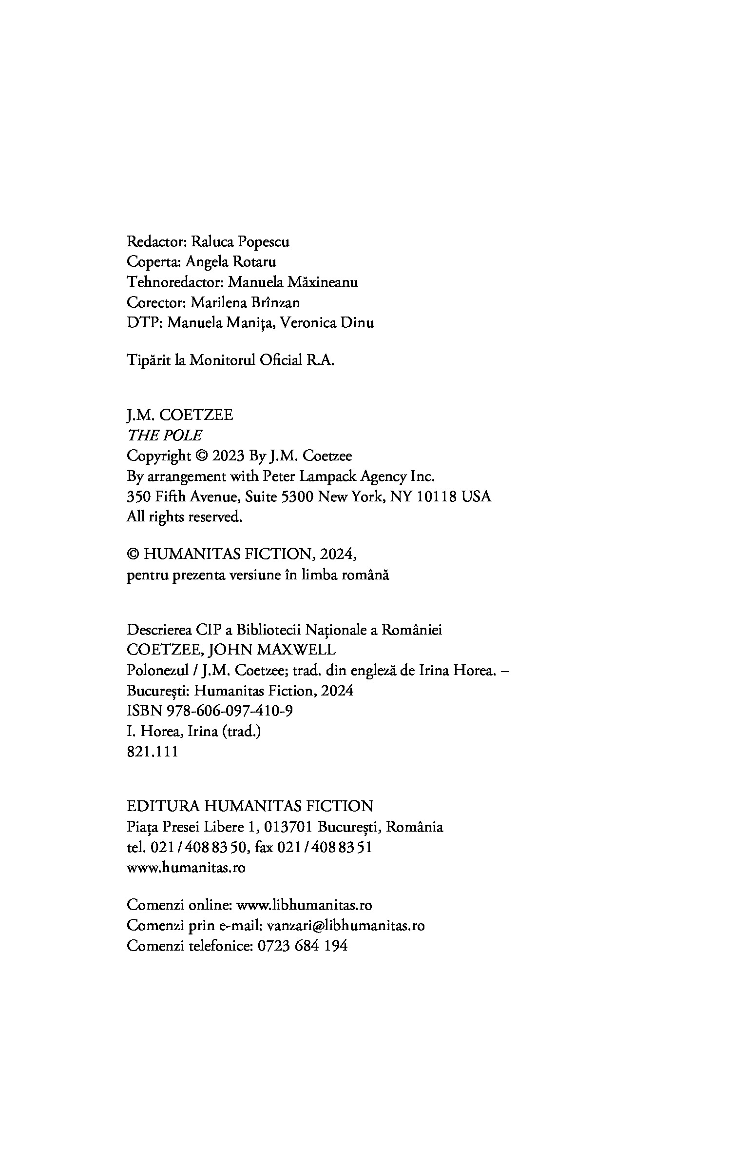 JOHN MAXWELL COETZEE s-a născut pe 9 februarie 1940 la Cape Town, în Africa de Sud. Îşi încheie strălucit studiile de literatură engleză şi matematică la University of Cape Town în 1961, apoi se mută în Anglia, unde lucrează ca programator. Îşi ia doctoratul cu o analiză stilistică pe calculator a operelor lui Samuel Beckett la University of Texas, Austin (1965–1969), ţine cursuri de literatură la State University of New York, Buffalo, până în 1971, apoi la University of Cape Town până în 2002. Debutează cu romanul Ținuturi în crepuscul (Dusklands, 1974; Humanitas Fiction, 2019), urmat de În inima țării (In the Heart of the Country, 1977; Humanitas Fiction, 2017) și Așteptându-i pe barbari (Waiting for the Barbarians, 1980; Humanitas Fiction, 2014), care îi aduce James Tait Black Memorial Prize. Publică apoi Viața și vremurile lui Michael K (Life & Times of Michael K, 1983; Humanitas Fiction, 2009), distins cu Booker Prize și Prix Femina Étranger, Foe (1986 —Jerusalem Prize, 1987; Humanitas Fiction, 2016), Epoca de fier (The Age of Iron, 1990 — Sunday Express Book of the Year; Humanitas Fiction, 2010, 2016) și Maestrul din Petersburg (The Master of Petersburg, 1994 — Irish Times International Fiction Prize, 1995; Humanitas Fiction, 2008, 2015). Copilărie (Boyhood, 1997; Humanitas Fiction, 2010), Tinerețe (Youth, 2002; Humanitas Fiction, 2011) și Miezul verii (Summertime, 2009; Humanitas Fiction, 2012) fac parte din ciclul autobiografic Scene de viață provincială (Scenes from Provincial Life). Romanul Dezonoare (Disgrace, 1999; Humanitas Fiction, 2011) îi aduce un nou Booker Prize, iar Elizabeth Costello (2003; Humanitas Fiction, 2015) și Slow Man (2005) se bucură de o foarte bună receptare. În 2007 apare Jurnalul unui an prost (Diary of a Bad Year; Humanitas Fiction, 2009). Romanul Copilăria lui Isus (The Childhood of Jesus; Humanitas Fiction, 2014) vede lumina tiparului în 2013, iar în 2016, Zilele de școală ale lui Isus (The Schooldays of Jesus; Humanitas Fiction, 2018). Moartea lui Isus (The Death of Jesus; Humanitas Fiction, 2021) încheie trilogia în 2019. J.M. Coetzee este autorul unor volume de eseuri filozofice și literare. Din 2002 trăiește în Australia, fiind profesor emerit la University of Adelaide. În 2003 i se atribuie Premiul Nobel pentru literatură.
