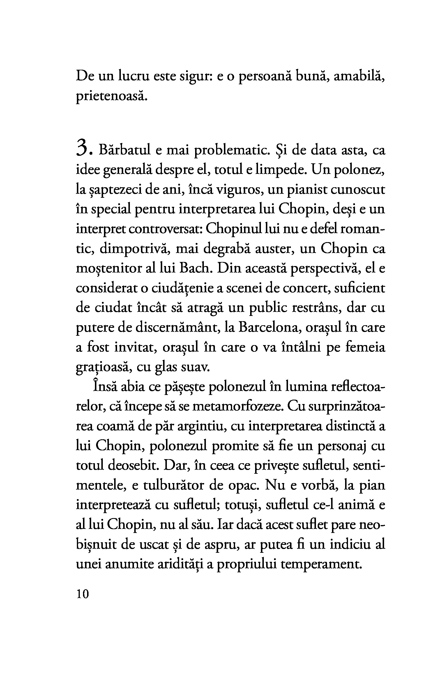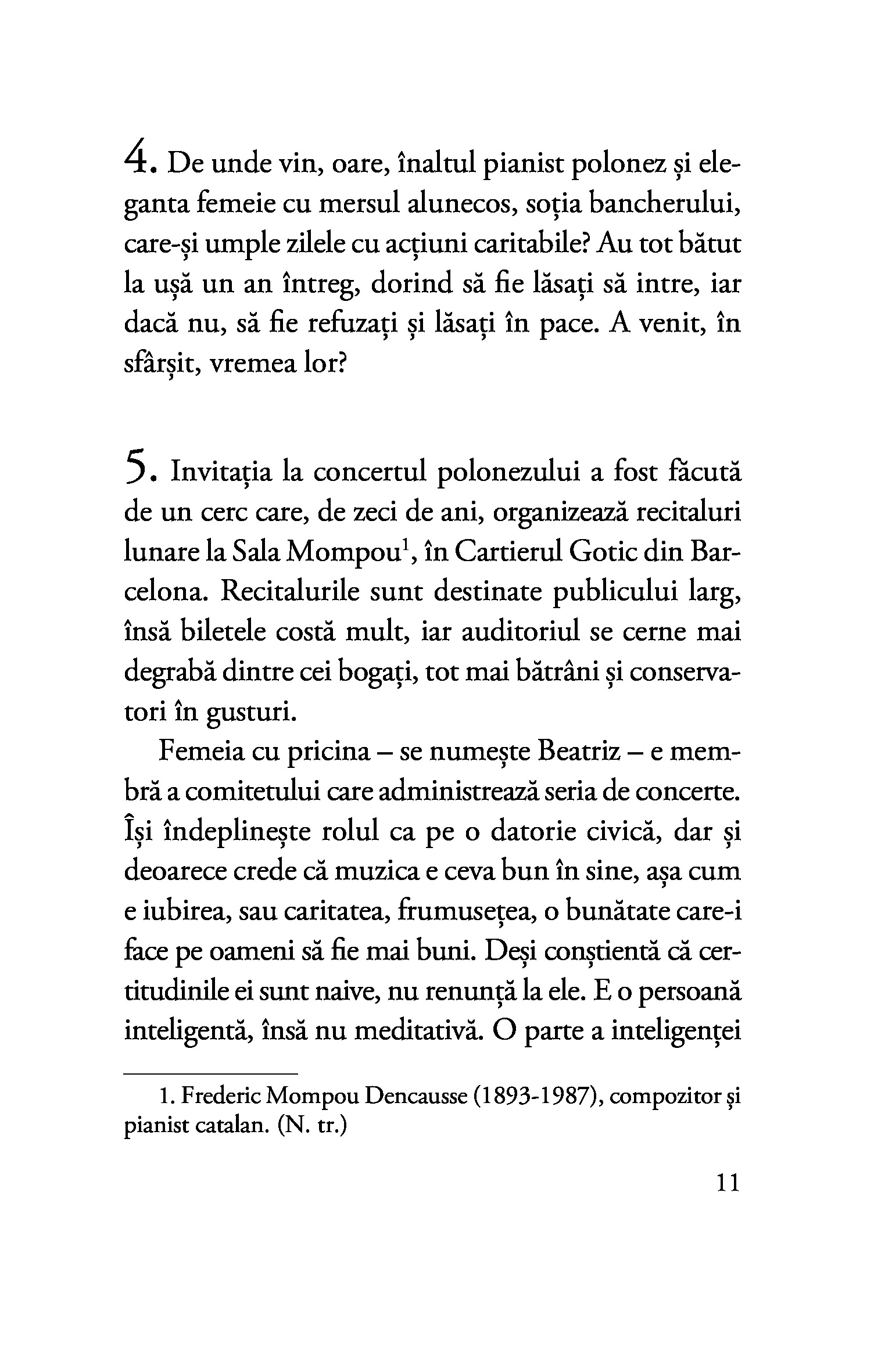 O întâlnire convențională între un pianist polonez și o doamnă din lumea bună a Barcelonei devine punctul de plecare al unei idile ciudate, a cărei definiție le scapă până și protagoniștilor. Delicat și sobru construită, povestea imaginată de Coetzee analizează misterul sentimentelor, al căror adevăr este mereu falsificat de neputința cuvintelor.