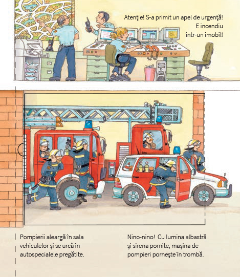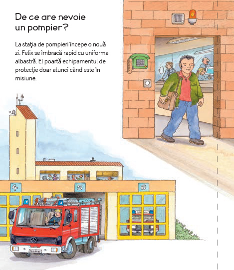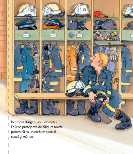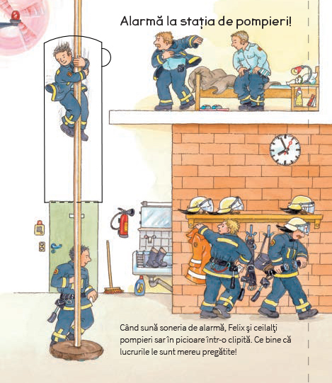Alarmă la stația de pompieri! Repede, Felix și colegii săi își pun uniformele și alunecă pe bară. Intră în mașinile de pompieri și pornesc rapid spre locul incendiului. Copiii mici pot urmări toate aceste activități explorând imaginile și deschizând ferestrele din paginile cărții.
