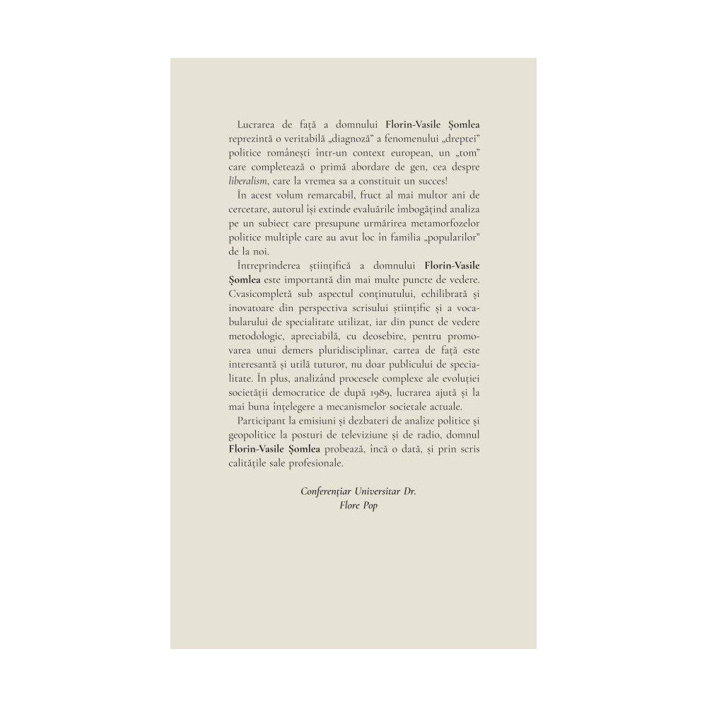 Lucrarea de față a domnului Florin-Vasile Șomlea reprezintă o veritabilă „diagnoză” a fenomenului „dreptei” politice românești într-un context european, un „tom” care completează o primă abordare de gen, cea despre liberalism, care la vremea sa a constituit un succes!