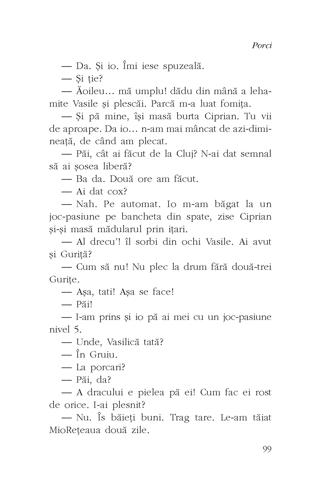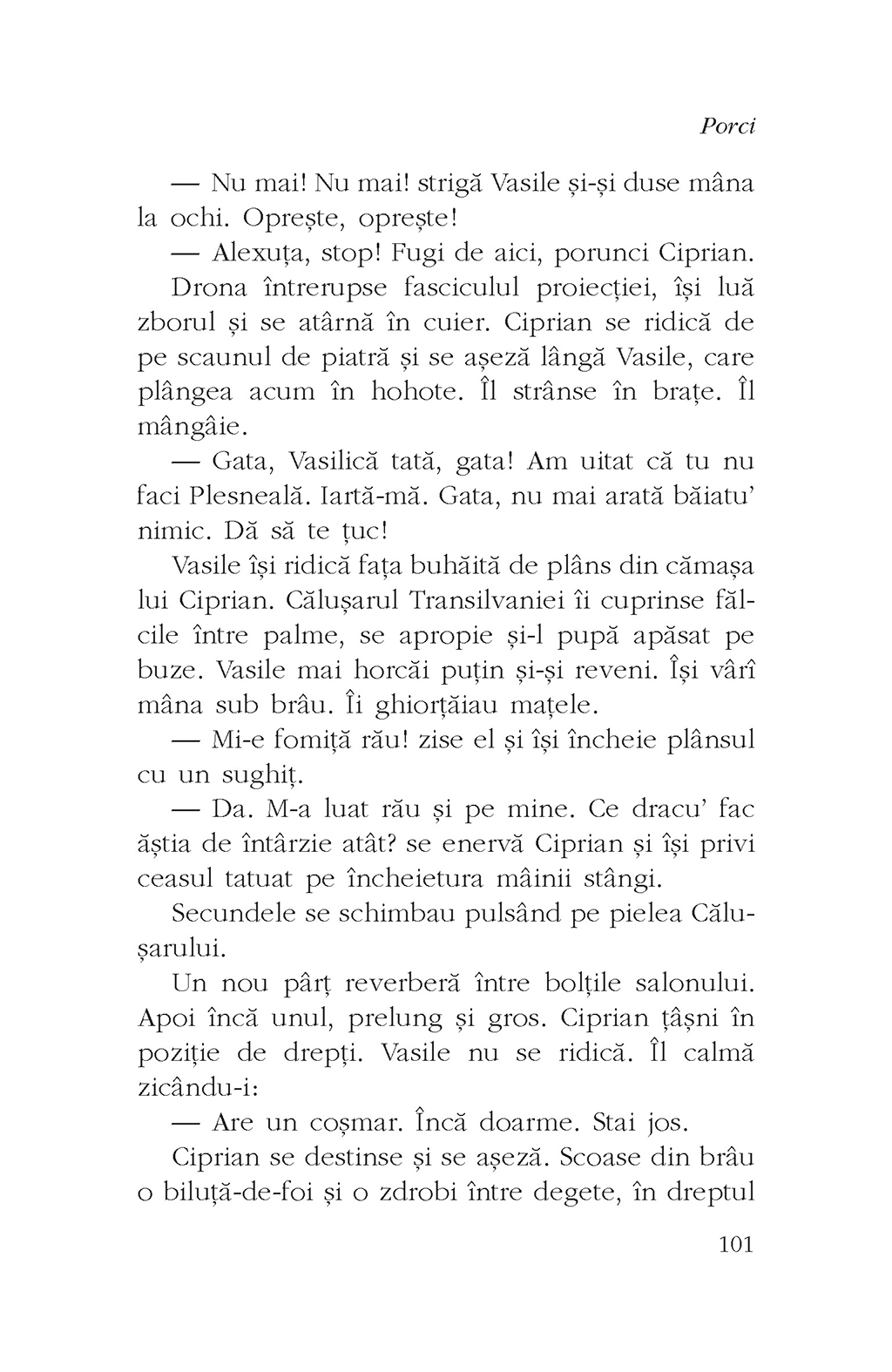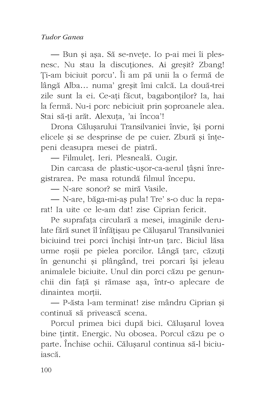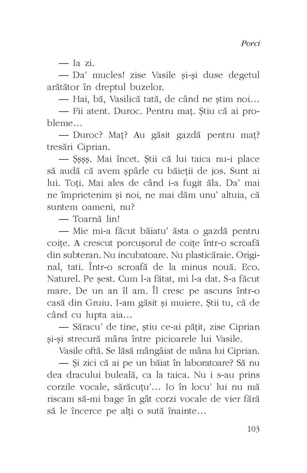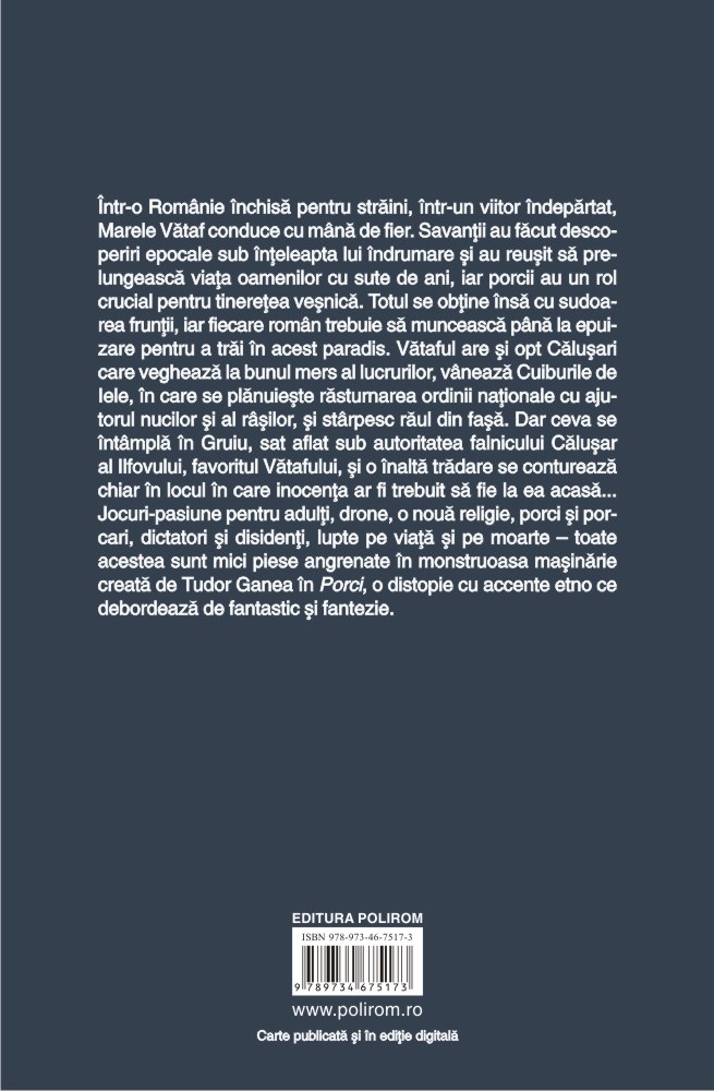 Într-o Românie închisă pentru străini, într-un viitor îndepărtat, Marele Vătaf conduce cu mînă de fier. Savanţii au făcut descoperiri epocale sub înţeleapta lui îndrumare şi au reuşit să prelungească viaţa oamenilor cu sute de ani, iar porcii au un rol crucial pentru tinereţea veşnică. Totul se obţine însă cu sudoarea frunţii, iar fiecare român trebuie să muncească pînă la epuizare pentru a trăi în acest paradis. Vătaful are şi opt Căluşari care veghează la bunul mers al lucrurilor, vînează Cuiburile de Iele, în care se plănuieşte răsturnarea ordinii naţionale cu ajutorul nucilor şi al rîşilor, şi stîrpesc răul din faşă. Dar ceva se întîmplă în Gruiu, sat aflat sub autoritatea falnicului Căluşar al Ilfovului, favoritul Vătafului, şi o înaltă trădare se conturează chiar în locul în care inocenţa ar fi trebuit să fie la ea acasa... Jocuri-pasiune pentru adulţi, drone, o nouă religie, porci şi porcari, dictatori şi disidenţi, lupte pe viaţă şi pe moarte – toate acestea sunt mici piese angrenate în monstruoasa maşinărie creată de Tudor Ganea în Porci, o distopie cu accente etno ce debordează de fantastic şi fantezie.