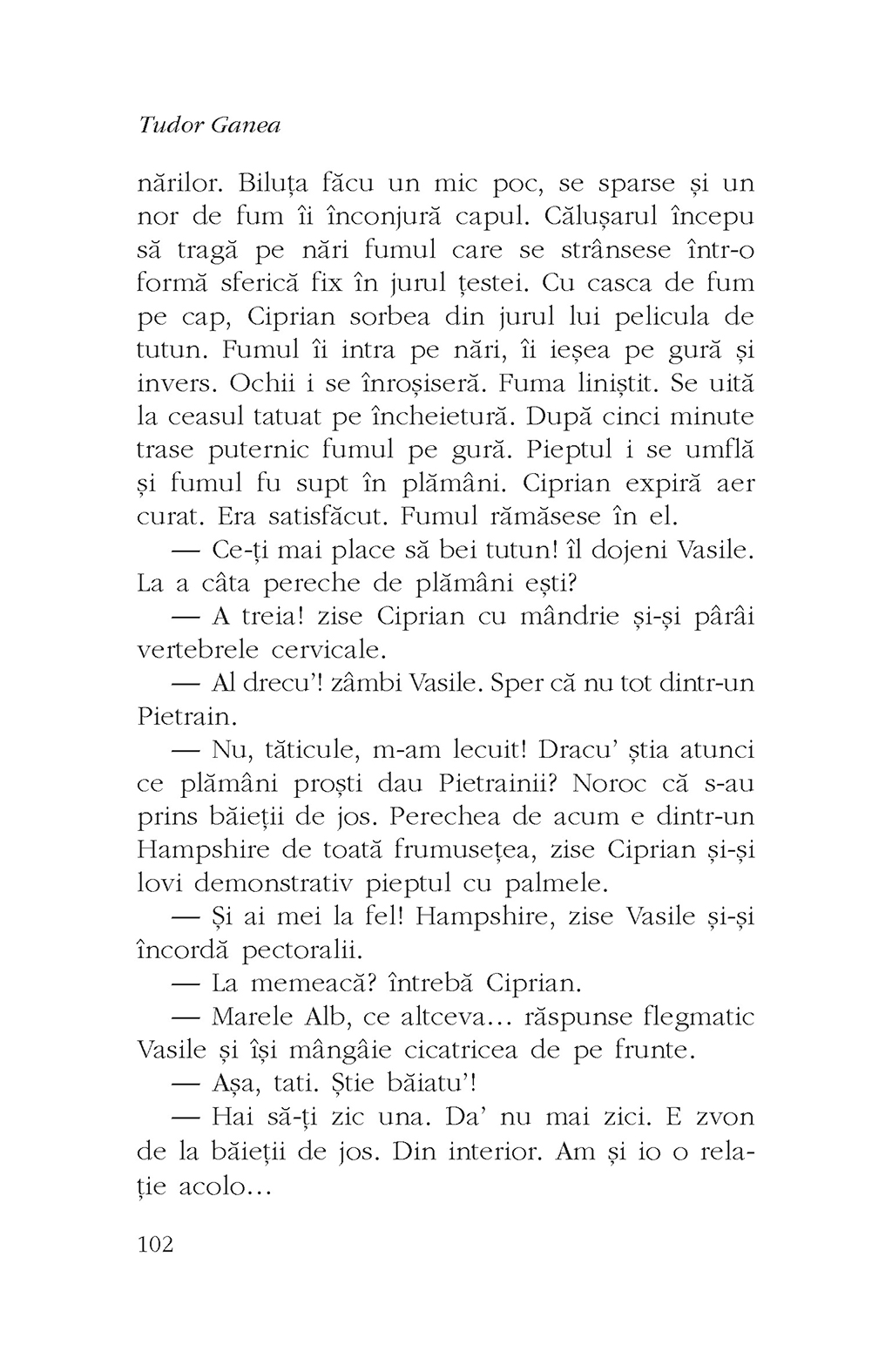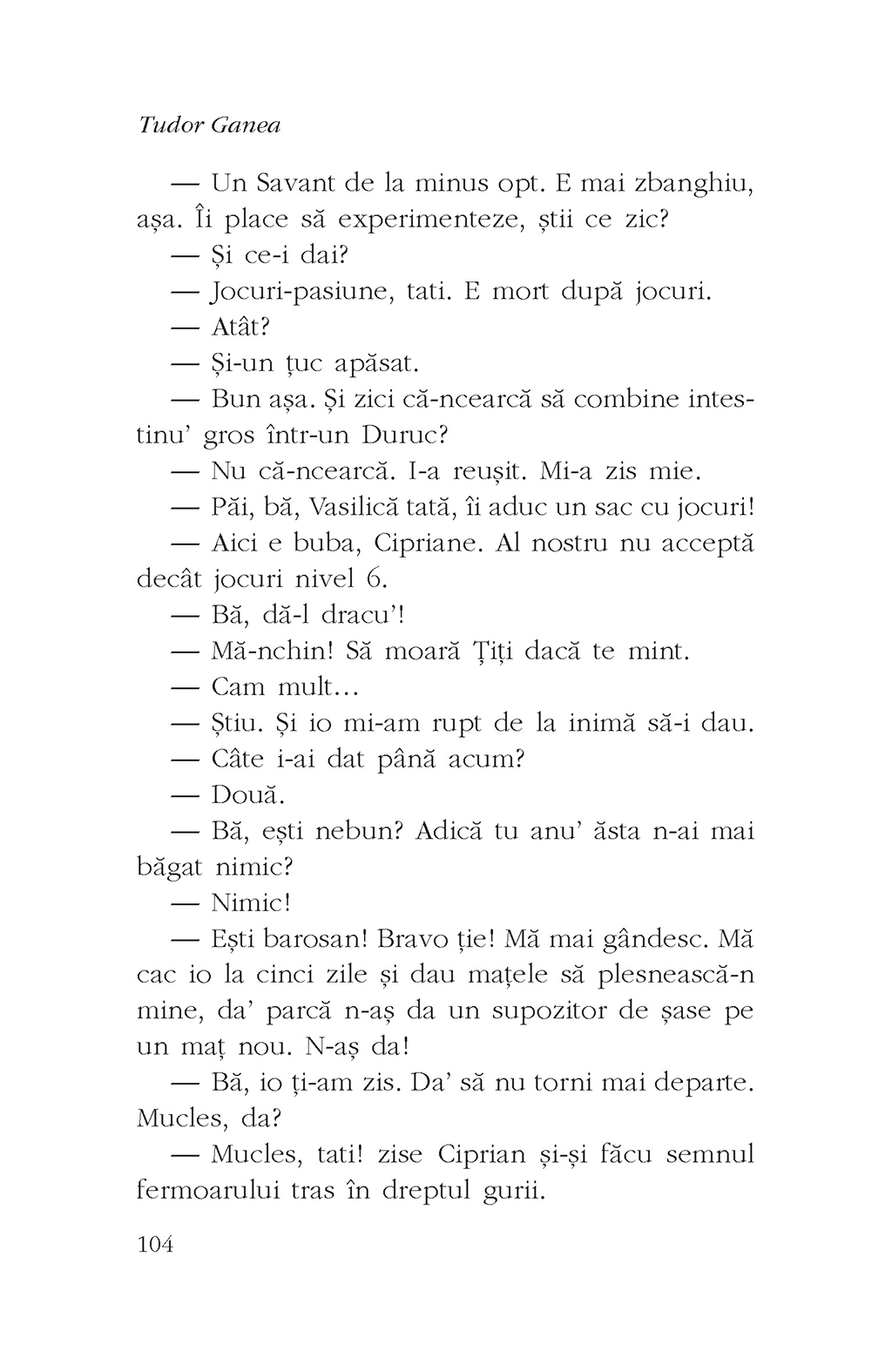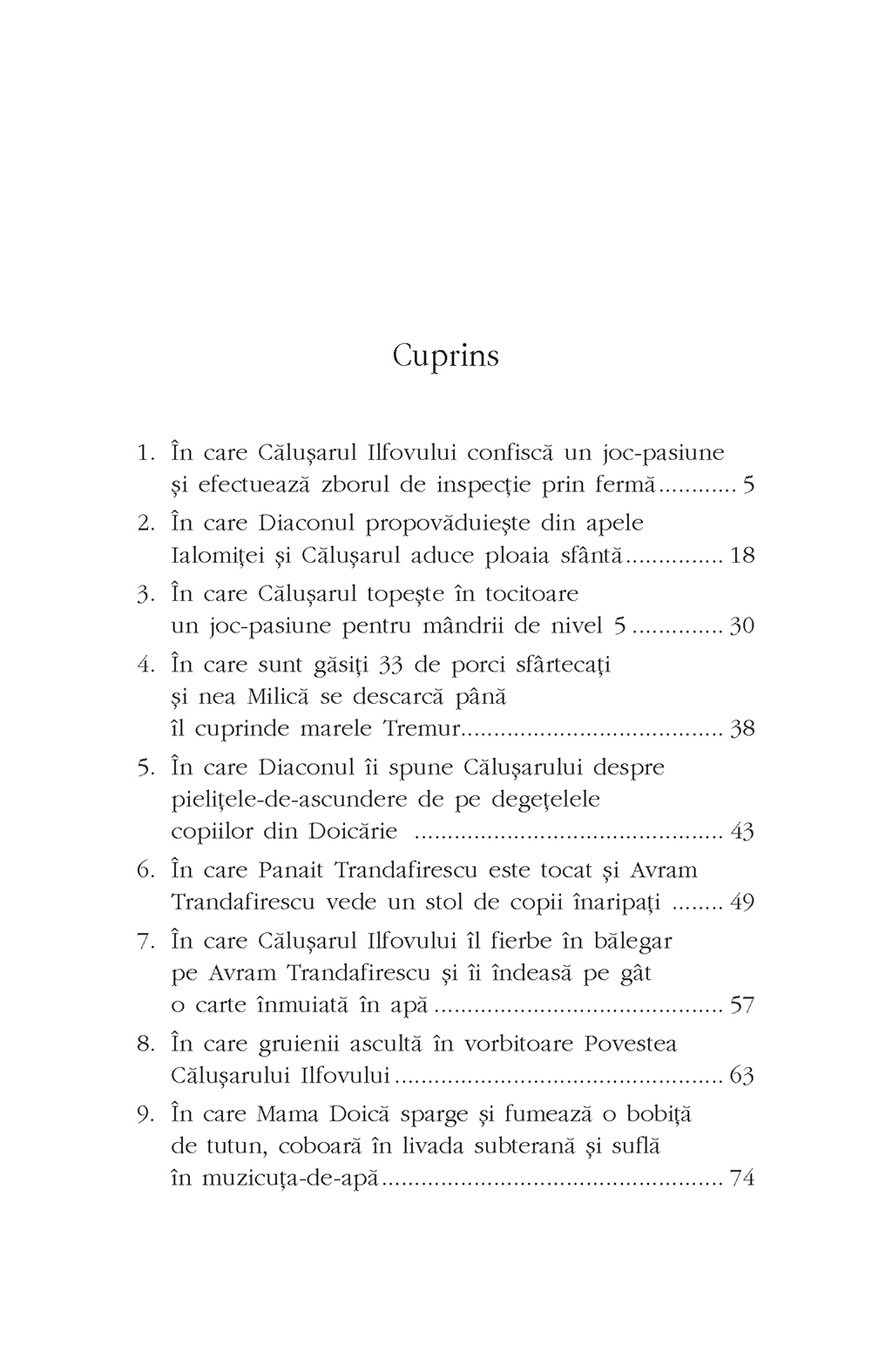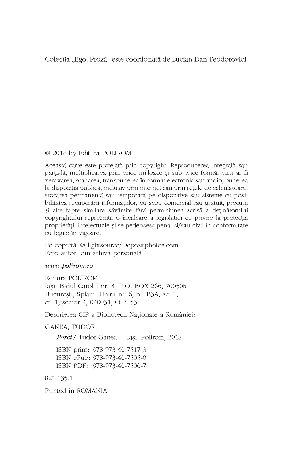 Într-o Românie închisă pentru străini, într-un viitor îndepărtat, Marele Vătaf conduce cu mînă de fier. Savanţii au făcut descoperiri epocale sub înţeleapta lui îndrumare şi au reuşit să prelungească viaţa oamenilor cu sute de ani, iar porcii au un rol crucial pentru tinereţea veşnică. Totul se obţine însă cu sudoarea frunţii, iar fiecare român trebuie să muncească pînă la epuizare pentru a trăi în acest paradis. Vătaful are şi opt Căluşari care veghează la bunul mers al lucrurilor, vînează Cuiburile de Iele, în care se plănuieşte răsturnarea ordinii naţionale cu ajutorul nucilor şi al rîşilor, şi stîrpesc răul din faşă. Dar ceva se întîmplă în Gruiu, sat aflat sub autoritatea falnicului Căluşar al Ilfovului, favoritul Vătafului, şi o înaltă trădare se conturează chiar în locul în care inocenţa ar fi trebuit să fie la ea acasa... Jocuri-pasiune pentru adulţi, drone, o nouă religie, porci şi porcari, dictatori şi disidenţi, lupte pe viaţă şi pe moarte – toate acestea sunt mici piese angrenate în monstruoasa maşinărie creată de Tudor Ganea în Porci, o distopie cu accente etno ce debordează de fantastic şi fantezie.