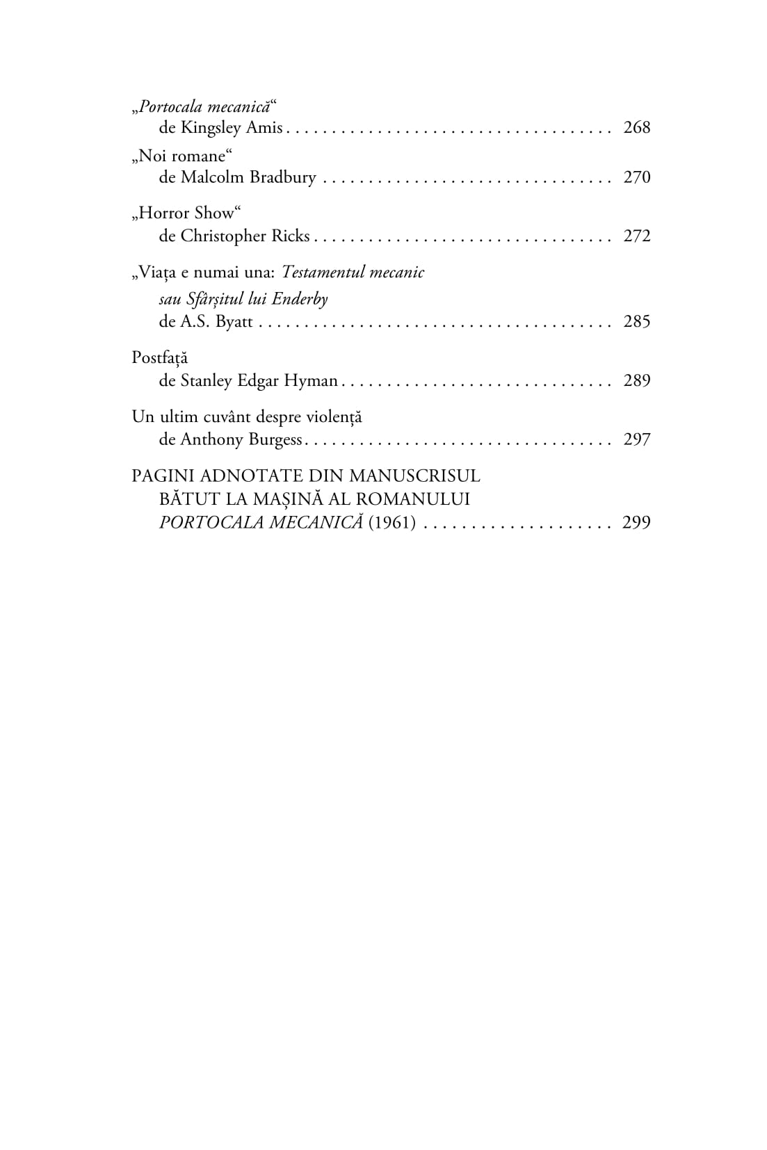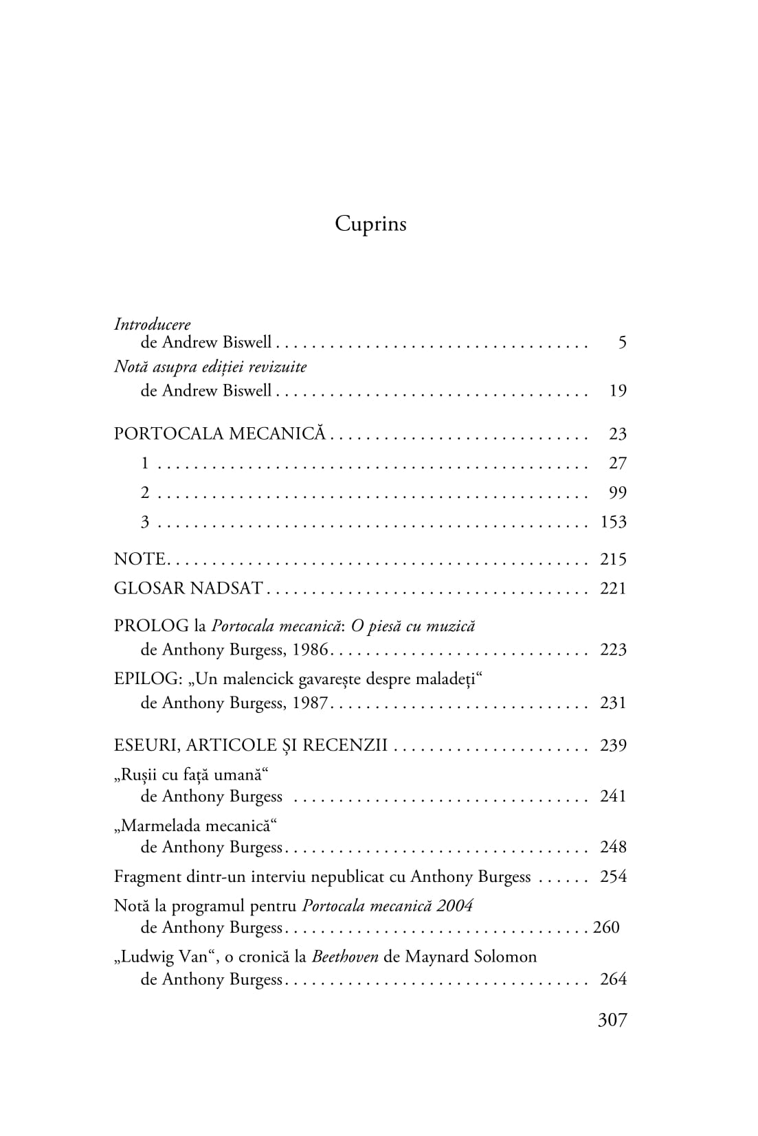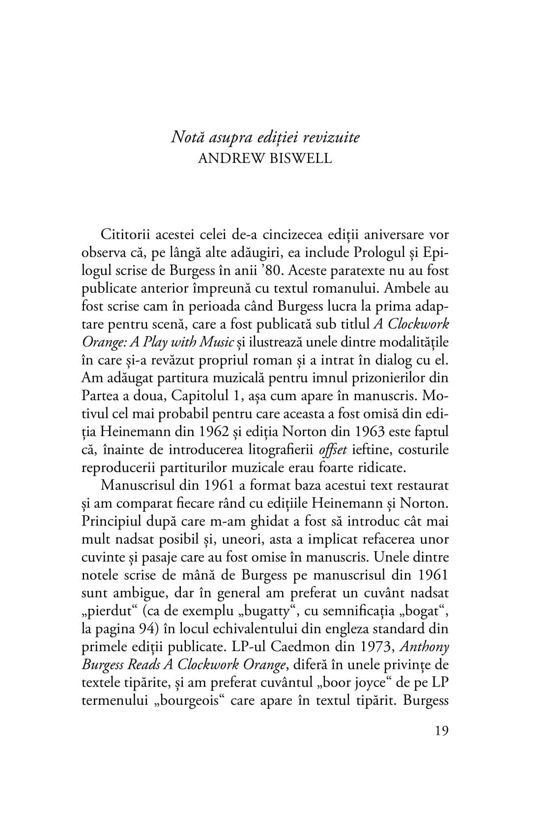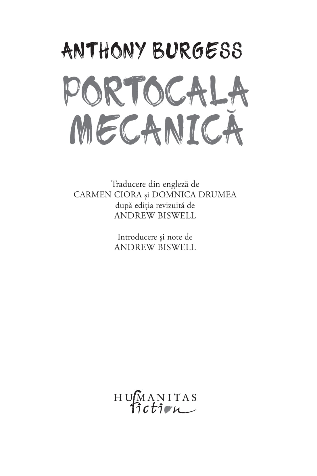 Acest volum urmează ediția jubiliară alcătuită de Andrew Biswell. Ea cuprinde romanul revizuit după manuscrisul original din 1961, comparat cu mai multe variante publicate în timp, însoțit de Prologul și Epilogul scrise de Anthony Burgess în anii ’80 pentru versiunea dramatică, de eseuri, articole și fragmente inedite din interviuri ale scriitorului care țin de geneza, transpunerea cinematografică și scenică a cărții, precum și de recenzii semnate de mari autori. Portocala mecanică a fost ecranizată de Stanley Kubrick în 1971, într-un film celebru, avându-i în rolurile principale pe Malcolm McDowell, Patrick Magee și Michael Bates.