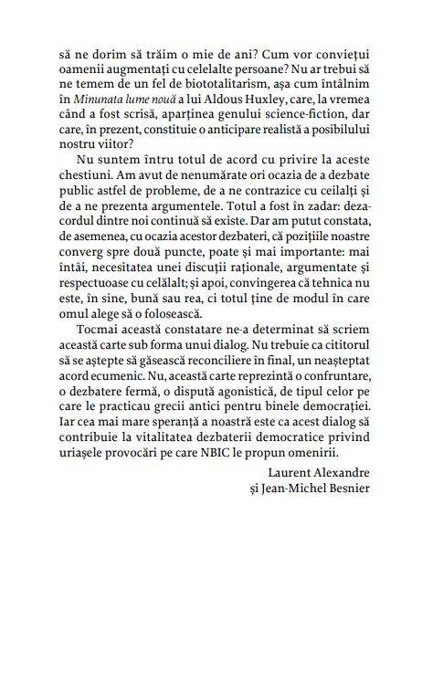 „Școala din 2050 nu se va mai ocupa de cunoștințe, ci de creiere. Cei trei piloni ai școlii – conținutul, metoda, personalul – trebuie reconsiderați. Mai întâi, vor trebui reabilitate științele umaniste și cultura generală, deoarece concurența cu mașinile în ceea ce privește materiile tehnice va fi în curând inutilă. Apoi, vor trebui personalizate sistemele educaționale, în funcție de caracteristicile neurobiologice și cognitive ale fiecărui elev. În fine, vor trebui aduși în școli specialiști în domeniul neuroștiințelor, deoarece profesorul din 2050 va fi în primul rând un expert în «neurocultură». Introducerea tehnologiilor NBIC, în scopul de a îmbunătăți tehnicile educative, va cere în același timp și o reflecție neuroetică temeinică: nimeni nu dorește ca școala să devină o instituție neuromanipulatoare. În fața provocării lansate de generalizarea inteligenței artificiale, este nevoie urgentă de a demara modernizarea educaţiei. Numai așa vom contrazice profeția lui Bill Joy, cofondator al companiei Sun Microsystems, care în anul 2000 prevedea că «viitorul nu va avea nevoie de noi».“ – Laurent Alexandre